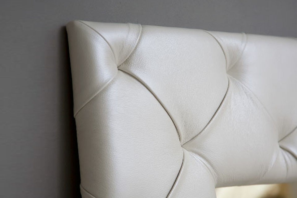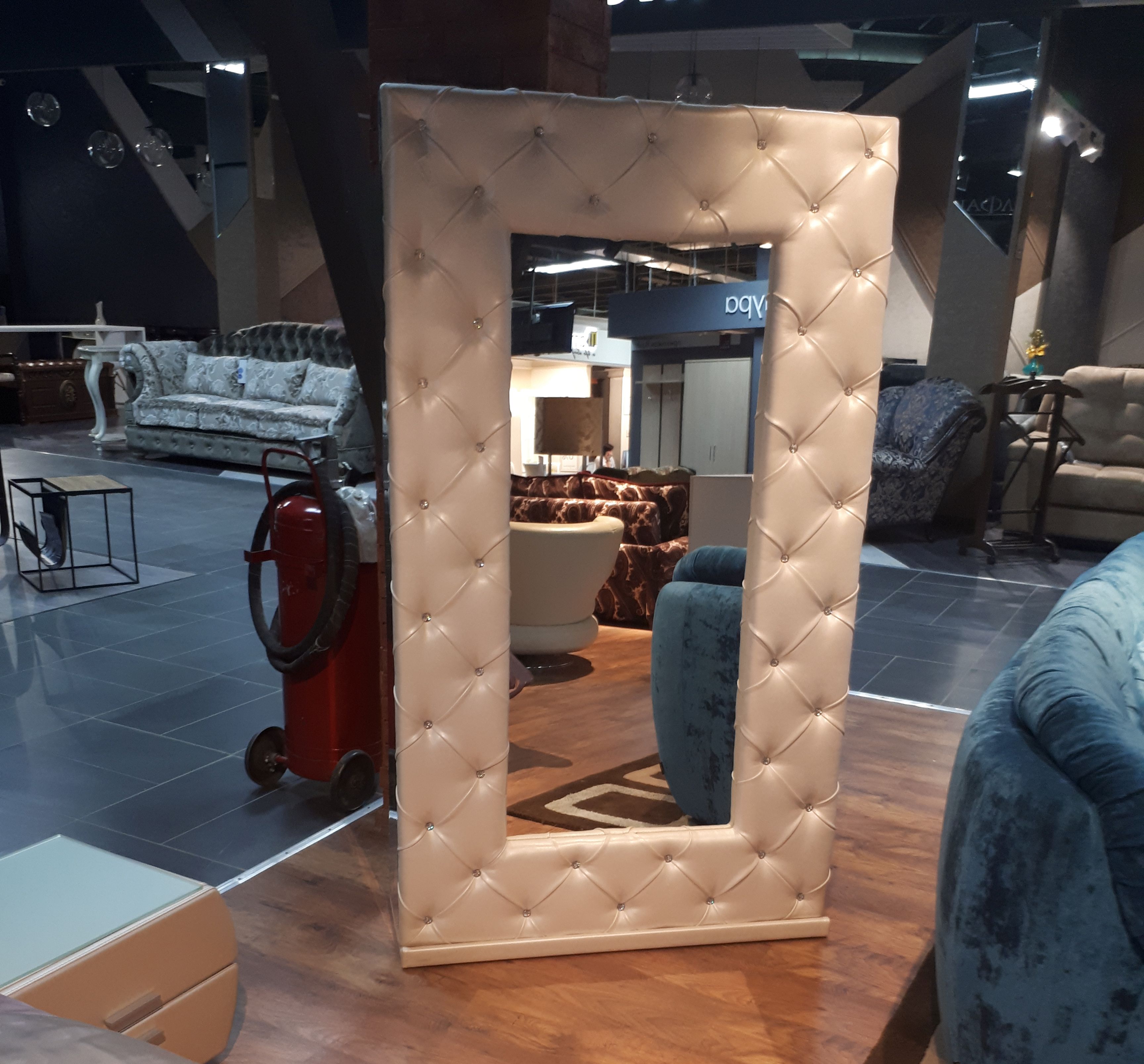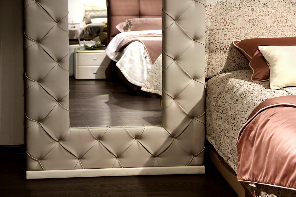 Зеркало может быть выполнено в коже или ткани без декора либо декорировано стежкой, стразами, утяжками, утяжками и пуговицами или утяжками и стразами.