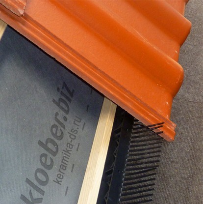 При устройстве кровли в числе наиболее ответственных узлов находится карнизный свес. Поэтому его конструкция должна выполняться в соответствии с техническими требованиями по правильной эксплуатации крыши. Среди таких требований, правильное обустройство водостоков, вентиляция крыши с доступом воздуха в подкровельное пространство, подшивка свеса для эстетической привлекательности. Вентиляционным элементом здесь выступает аэроэлемент свеса Kloeber для черепицы Braas любого профиля. Аэроэлемент совмещен с гребенкой, выравнивает первый ряд черепицы со всем скатом и защищает от проникновения птиц и попадания листвы под кровлю. Устанавливается на карнизном свесе под первый ряд черепицы.Выполнен из ПВХ, окрашенной в тон кровельной черепице. Представляет собой уже готовую деталь, в состав которой входит вентилируемая карнизная планка с гребнем. Сечение вентиляции 200 кв.см./п.м. Присоединяется штекерным способом. Преимущества: Зубчатая структура, обеспечивающая надежную вентиляцию. Замещает нижний ряд обрешетки. Препятствует залетанию птиц под кровлю. Устойчивый к воздействию ультрафиолета, ветра, мороза, высоким и низким температурам. Долговеность. Универсальность.