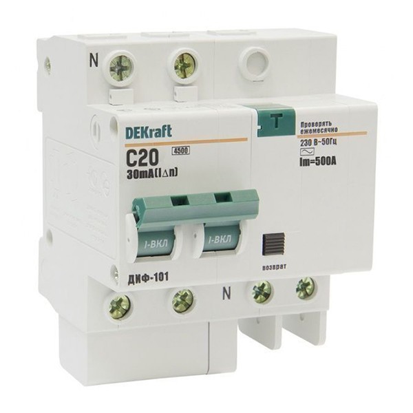 Автоматический выключатель DEKraft ДИФ-101 2п C 20А 30мА тип AC 4.5кА дифференциального тока