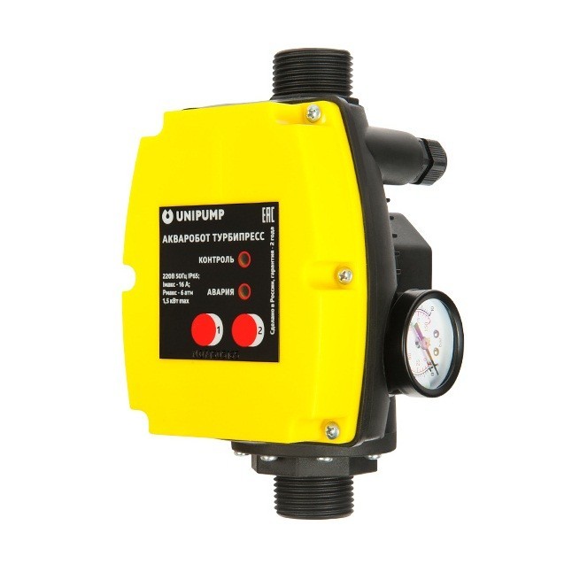 Блок Unipump Акваробот Турбипресс предназначен для автоматического управления однофазными поверхностными и погружными насосами мощностью до 2,2 кВт. Функциональные возможности блока управления насосами Unipump Акваробот Турбипресс: Автоматически управляет работой насоса, поддерживая в системе водоснабжения заданные пользователем пороги минимального и максимального давления – Рмин и Рмакс. Выключает насос при отсутствии потока воды. Переводит его в режим аварии при сухом ходе и при заклинивании насоса. Автоматически выключает насос в случае, если давление в системе достигло предельной величины Рпред (5,5–7 атм), и автоматически переводит устройство в рабочий режим при снижении давления до величины, ниже Рпред. Обеспечивает устойчивую работу насоса при пониженном напряжении сети – до 170 В. Блок управления насосами Unipump Акваробот Турбипресс состоит из пластикового корпуса, внутри которого установлены датчик давления, датчик потока и печатная плата с микроконтроллером. На корпусе имеется манометр для визуального контроля величины давления в системе. На лицевой поверхности корпуса находятся две кнопки управления, а также два светодиода индикации режимов работы — красный (авария) и зеленый (контроль). Принцип действия устройства основан на том, что включение и выключение насоса производится по командам микроконтроллера на печатной плате в соответствии с заданной программой. Входные параметры — это давление в системе и скорость потока воды, в зависимости от величины которых, микроконтроллер подает команды на включение, либо отключение насоса.