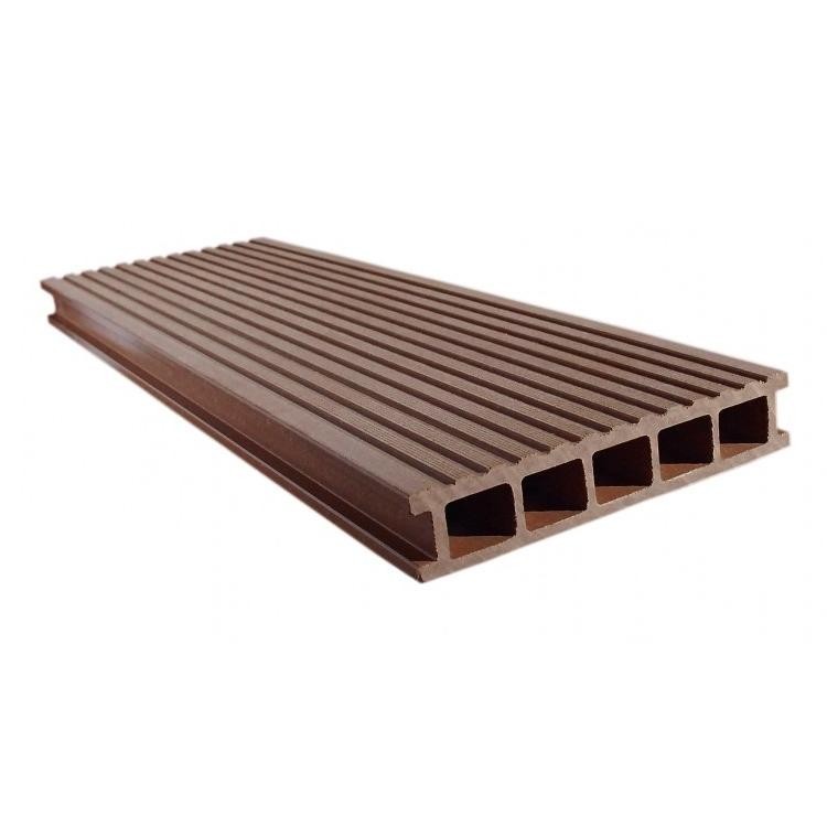 Террасная доска Eurodeck Даббл Шоколад будет радовать Вас своей универсальностью при монтаже, обеспечивая возможность создать неповторимый образ настоящего деревянного настила, или элегантный и лаконичный вельветовый рисунок. Бесшовный декинг скроет крепления, а также исключит проникновение через термические зазоры мелких деталей, монет, украшений и каблуков.Стороны доски обработаны с применением технологии тиснения и глубокий вельвет. Рекордные показатели прочности: нагрузка 3450 кг. на м. кв. обеспечивают широкий спектра применения. Террасная доска из древесно-полимерного композита Eurodeck Даббл Шоколад производится методом экструзии из волокон натурального дерева (60 %) с включением полимерных добавок — полиэтилена низкого давления (35 %), а также аддитивов, улучшающих характеристики покрытия и позволяющих предотвратить выцветание (5 %) Благодаря такому составу, декинг смог объединить в себе преимущества двух популярных материалов — натуральной древесины и пластика. Преимущества террасной доски Eurodeck Даббл: высокие эстетичные характеристики; хорошие тепло- и звукоизоляционные свойства; повышенная прочность и стойкость к гниению; устойчивость к воздействию насекомых и грибков; защищенность от УФ-лучей; антискользящие свойства; отсутствие необходимости покраски и тонировки; равномерный яркий цвет на протяжении всего периода эксплуатации; износостойкость и простота монтажа; нетребовательностью в уходе. Террасная доска ДПК - доска из климатически устойчивого материала. Она не требует защитных покрытий, не коробится, не гниет, не покрывается плесенью, не выгорает на солнце в течение многих лет, не имеет сучков и дефектов. Диапазон температур применения продукции Евродек - от минус 50 °С до плюс 80 °С. Террасная доска Eurodeck серии Даббл является материалом сегмента Profesional и предназначен для использования на любых объектах с умеренными эксплуатационными нагрузками. Стандартный срок службы изделий из ДПК - 25 лет. Область применения террасной доски Eurodeck Даббл: террасы частных домов; частные садовые площадки; малые балконы; беседки, веранды, патио; садовые дорожки; летние кафе, причалы, и т.п. Материал не требует окрашивания или какой-либо другой дополнительной обработки цвет однороден по всей глубине изделий. Обрабатывается как обычная древесина, его можно пилить, строгать, крепить шурупами и саморезами. Облегчение веса конструкций, в качестве экономии, достигается благодаря использованию профилей, полых внутри, но с наличием ребер жесткости. На террасной доске из ДПК вам не грозят занозы, а рифленая и тисненая текстура предохранит Вас от скольжения по мокрой поверхности, на жарком солнце практически не нагревается, и босиком пройти сплошное удовольствие.