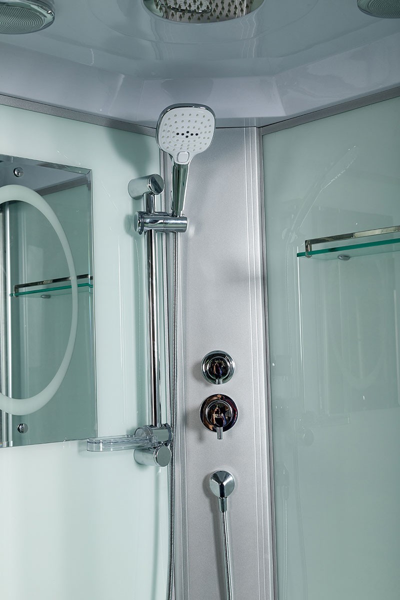 Душевой шланг, Душевая лейка, Полка, Сифон, Смеситель, Душевая штанга, Верхний душ, Зеркало |