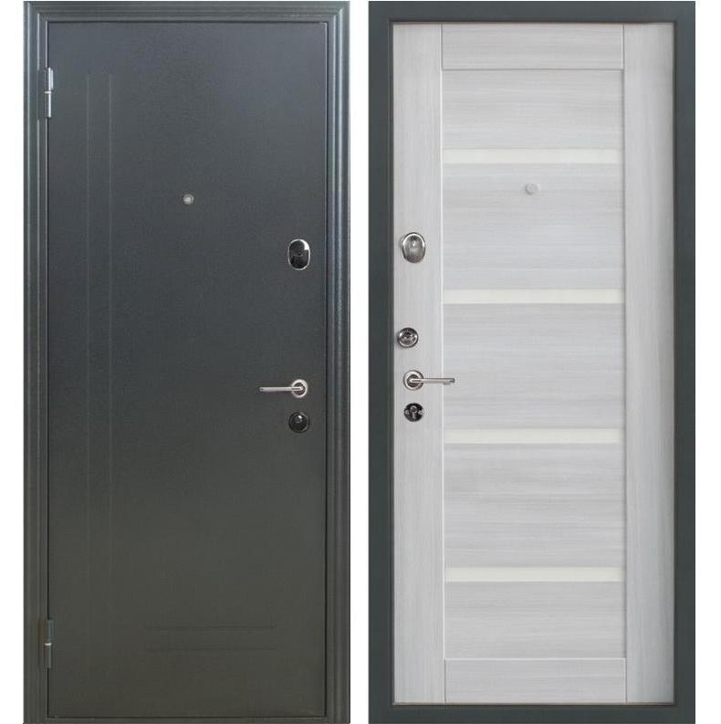 Дверь Меги 573 входная металлическая левая снаружи металл Серебро на черном внутри МДФ 0543 С Беленый дуб 2050х870 мм