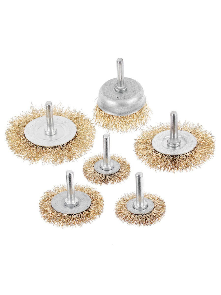 Набор металлических щеток включает в себя полезный комплект для работы. Шпильки позволяют устанавливать их на дрель для удаления побелки или краски.