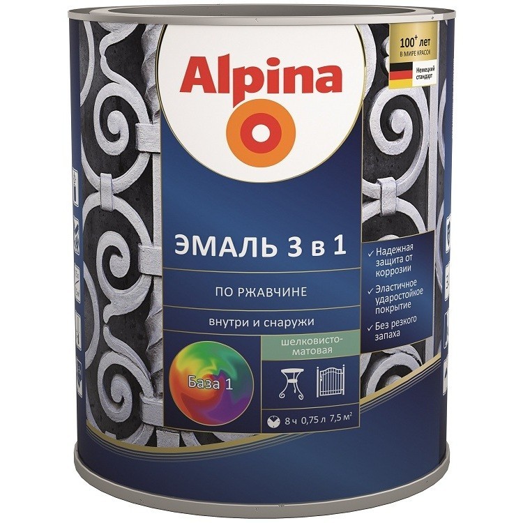 Эмаль Alpina 3 в 1 База 1 по ржавчине шелковисто-матовая 0,75 л
