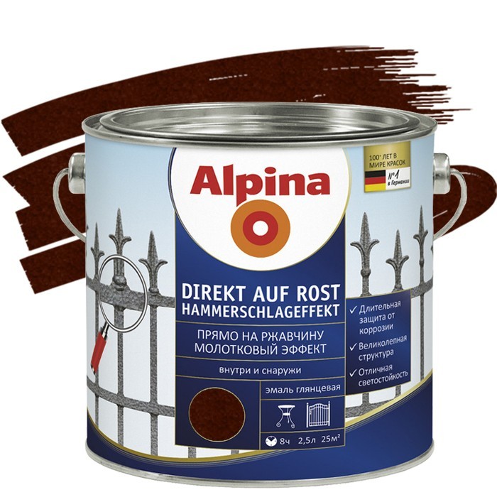 Alpina Direkt auf Rost – это специальная эмаль «четыре в одном», сочетающая в себе следующие свойства: отлично грунтует, защищает от коррозии, является грязеотталкивающим покрытием с декоративным молотковым эффектом. Используется эмаль для защиты металлических поверхностей от ржавчины. Благодаря высокой укрывистости и максимальной стойкости к различным погодным условиям Alpina Direkt auf Rost прекрасно подходит для наружных и внутренних работ. Устойчивость к загрязнению обеспечивает длительную защиту металлических поверхностей. Эмаль Alpina Direkt auf Rost быстро высыхает, что позволяет сразу приступать к последующим работам. Она наносится в три тонких слоя при выполнении работ снаружи помещений или два тонких слоя при работе с поверхностями внутри помещений. Эмаль позволяет получить покрытие, защищающее сталь и железо от ржавчины. К тому же эта эмаль практически без запаха как при ее нанесении, так и при высыхании. Благодаря своему грязеотталкваещему свойству, эмаль Alpina Direkt auf Rost является идеальной основой для защиты металлических поверхностей от коррозии на долгое время. Вне зависимости от инструмента нанесения — валиком, кистью или краскопультом — эта эмаль поражает своими отличными возможностями применения.