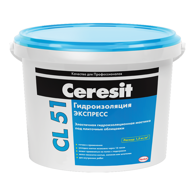 Гидроизоляционная масса Ceresit CL 51 – однокомпонентная полимерная масса для устройства эластичных водонепроницаемых покрытий под плиточные облицовки. Предназначена для устройства эластичных водонепроницаемых покрытий перед устройством плиточных облицовок в помещениях, подверженных периодическому увлажнению (ванных, душевых, туалетах, кухнях и т.д.). Особенности Ceresit CL 51: готова к применению; легко наносится кистью, валиком или шпателем; эластичная; перекрывает трещины раскрытием до 0,75 мм; может применяться на стяжках с подогревом; пригодна только для внутренних работ; не содержит растворителей; экологически безопасна.