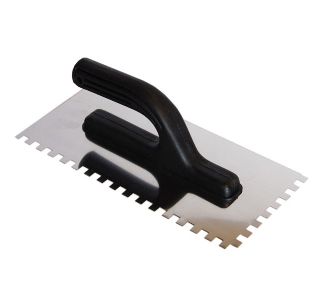 Гладилка зубчатая Master Color 30-2044 применяется для равномерного нанесения штукатурных, шпаклевочных и клеевых растворов на поверхность при штукатурных, облицовочных, каменных, бетонных, печных и других работах, а также для разравнивания уже нанесенной смеси на горизонтальных и вертикальных поверхностях. Инструмент имеет гладкие стороны для нанесения и выравнивания раствора, а также зубчатые стороны, которые используются для нанесения на поверхность борозд клея и помогают создать правильную толщину клеевого слоя. Полотно выполнено из немецкой нержавеющей стали. Размер 270х130 мм, размер зубцов составляет 10x10 мм. Удобная пластиковая ручка надежно прикреплена к полотну.