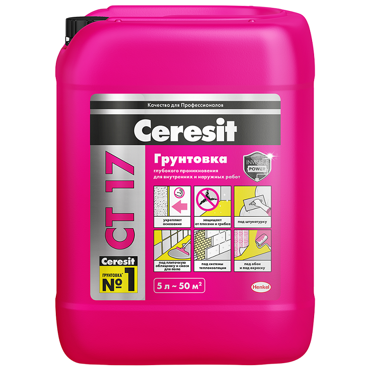 Водно-дисперсионная грунтовка глубокого проникновения Ceresit CT 17 Зима служит укрепления и пропитки оснований под отделочные, гидроизоляционные, теплоизоляционные и другие покрытия. Серия «Зима» обладает морозостойкими свойствами. Допускается 5-кратное замораживание общей продолжительностью не более 2 недель при температуре не ниже -40С. Грунтовка CT 17 предназначена для обработки поверхностей перед нанесением штукатурных и напольных смесей,плиточных клеев и т.д. Применяется для обработки всех видов впитывающих оснований: бетона, цементно-песчаных штукатурок и стяжек, известковых и гипсовых штукатурок, легкого и ячеистого бетона, ангидритных стяжек, кладок из кирпича и природного камня, древесностружечных и древесноволокнистых плит, гипсокартона и т.д. Обладает высокой проникающей способностью, снижает впитывающую способность оснований, связывает пыль, укрепляет поверхность, предотвращает пересыхание тонкослойных выравнивающих смесей, повышает адгезию материалов к основанию, повышает растекаемость напольных смесей и предотвращает появление пузырьков воздуха на выравнивающем слое. Благодаря содержанию пигмента позволяет легко отличить обработанную поверхность. Свойства грунтовки Ceresit CT 17: укрепляет поверхность и связывает пыль; снижает впитывающую способность основания; имеет высокую проникающую способность; не снижает паропроницаемость основания; светло-желтый цвет позволяет легко отличить загрунто-ванную поверхность от незагрунтованной; может применяться на стяжках с подогревом; доступна также в морозостойкой версии «Зима»; пригодна для наружных и внутренних работ экологически безопасна. Грунтовку наносят на основание, не разбавляя, с помощью щётки или кисти. При обработке сильно впитывающих оснований и ангидритных полов грунтовку наносят за два рабочих прохода, причем при первом проходе используют грунтовку, разбавленную водой в соотношении 1:1. Дальнейшие отделочные работы можно производить только после полного высыхания грунтовки (через 4–6 часов после нанесения, в зависимости от условий высыхания). Подготовка основания: Основание должно быть ровным, сухим и достаточно прочным. Поверхность его должна быть очищена от разного рода загрязняющих веществ (пыли, жиров, смазочных масел, битумных мастик, лакокрасочных покрытий и т.п.). Осыпающиеся участки поверхности нужно тщательно обмести. Дефектные, слабые и отслаивающиеся участки поверхности следует удалить и поверхность отремонтировать. Малярные покрытия, имеющие низкую адгезию, должны быть полностью удалены. Окна, двери и прочие конструктивные элементы, а также прилегающие поверхности, не подлежащие обработке, необходимо укрыть плёнкой или бумагой для предохранения от загрязнения грунтовкой.