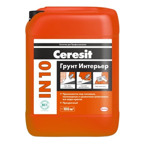 Грунтовка Ceresit IN 10 Грунт Интерьер предназначена для внутренних работ под финишную отделку. Она применяется для обработки поверхностей впитывающих оснований стен и потолков – цементных, известковых и гипсовых штукатурок, гипсокартонных листов и т.п. – перед нанесением гипсовых, цементных и полимерных шпаклевок, окрашиванием водно-дисперсионными красками и поклейкой обоев. Грунтовка обладает высокой проникающей способностью, снижает впитывающую способность оснований, связывает пыль, укрепляет поверхность, способствует равномерному нанесению красок и обойных клеев, снижает их расход. Свойства грунтовки Ceresit IN 10: бесцветная; способствует равномерному нанесению красок и обойных клеев, снижает их расход; подходит для обработки поверхности перед нанесением всех видов шпаклевок; укрепляет поверхность и связывает пыль; пригодна только для внутренних работ; не содержит органических растворителей.