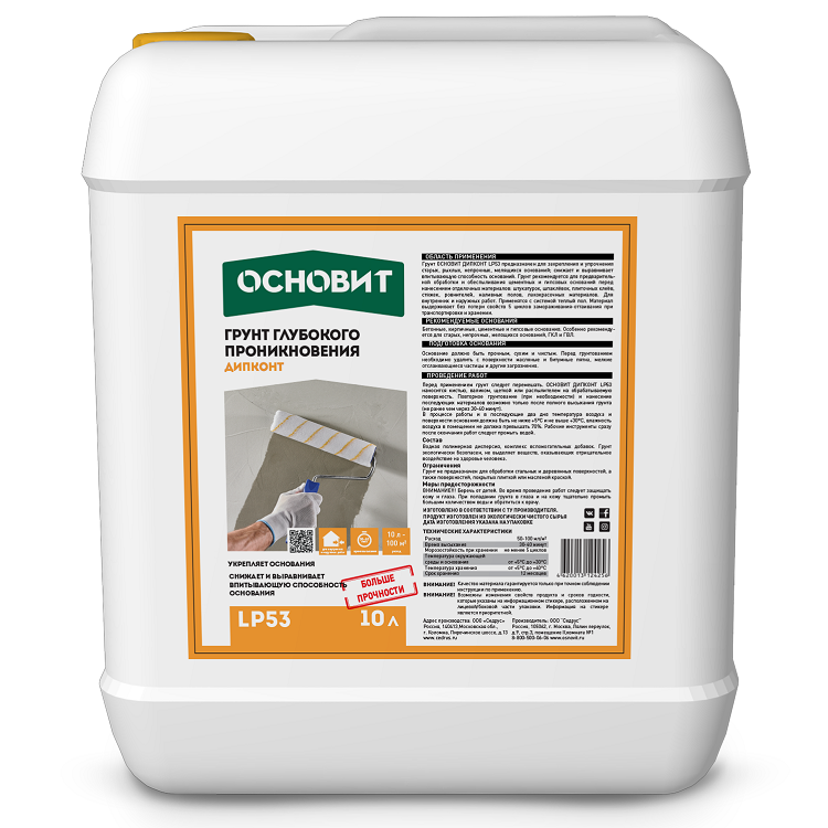 Грунтовка глубокого проникновения Основит Дипконт LP53 предназначена для закрепления и упрочнения старых, рыхлых, непрочных, мелящихся и сильновпитывающих оснований. Грунт рекомендуется для предварительной обработки и обеспыливания цементных и гипсовых оснований перед нанесением отделочных стройматериалов: штукатурок, шпатлёвок, плиточных клеёв, лакокрасочных материалов. Особенно рекомендуется для подготовки поверхности перед нанесением ровнителей для пола и наливных полов. Для наружных и внутренних работ. Свойства грунтовки Основит Дипконт LP53: для старых, непрочных и сильновпитывающих оснований; выравнивает впитывающую способность; улучшает прочность сцепления; паропроницаемый; для внутренних и наружных работ. Преимущества: Глубоко проникает в основание, укрепляя и повышая его износостойкость. Регулирует и снижает впитывающую способность оснований. Сокращает расход наносимых материалов, облегчая их нанесение и обеспечивая равномерность высыхания. Морозостойкость при хранении 5 циклов позволяет выдерживать многократное цикличное замораживание и оттаивание без изменения свойств. Грунт экологически безопасен, не выделяет веществ, оказывающих отрицательное воздействие на здоровье человека. Технические характеристики: Расход 50-100 мл/м² Время высыхания 30-40 минут Морозостойкость при хранении не менее 5 циклов Срок хранения 12 месяцев Температура эксплуатации -50˚С …+65 ˚С Температура окружающей среды и основания при нанесении +5˚С…+30˚С Вес упаковки 10 л Подготовка основания:Основание должно быть прочным, сухим и чистым. Перед грунтованием необходимо удалить с поверхности масляные и битумные пятна, мелкие от- слаивающиеся частицы и другие загрязнения. Проведение работ:Перед применением грунт следует перемешать. Основит Дипконт LP53 наносится кистью, валиком, щеткой или распылителем на обрабатываемую поверхность. Повторное грунтование (при необходимости) и нанесение по- следующих материалов возможно только после полного высыхания грунта (не ранее чем через 30-40 минут). В процессе работы и в последующие два дня температура воздуха и по- верхности основания должна быть не ниже +5ºС и не выше +30ºС, влажность воздуха в помещении не должна превышать 70%. Рабочие инструменты сразу после окончания работ следует промыть водой. Ограничения: Грунт не предназначен для обработки стальных и деревянных поверхно- стей, а также поверхностей, покрытых плиткой или масляной краской.