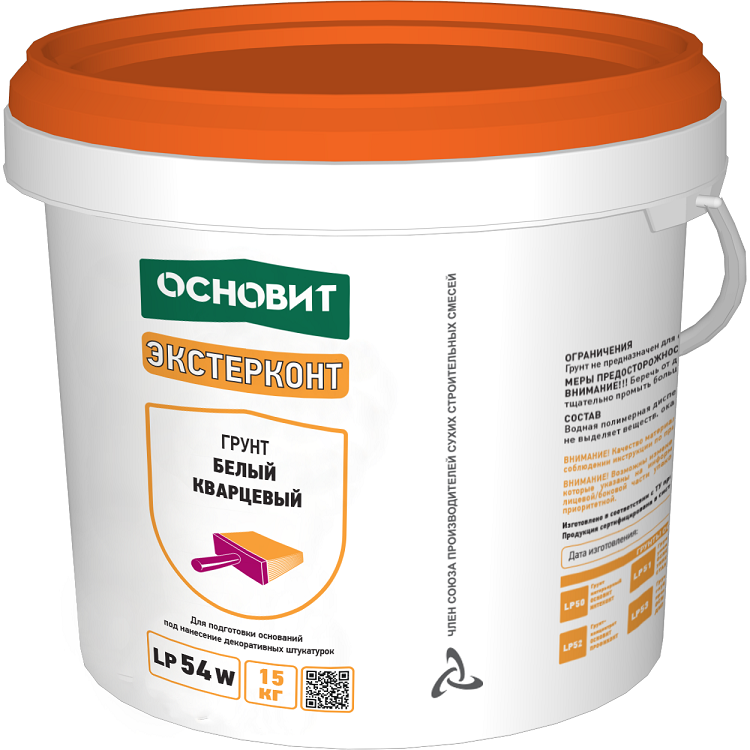 Грунт белый кварцевый Основит Экстерконт LP54 W предназначен для подготовки оснований под нанесения декоративных штукатурок. Снижает впитывающую способность основания. Создает структурную шероховатую поверхность. Рекомендуется применять в системах теплоизоляции «Основит». Свойства грунтовки Основит Экстерконт LP54 W: Снижает впитывающую способность основания, облегчая равномерность высыхания наносимых материалов и, соответственно, предотвращая образование трещин. Предотвращает просвечивания цвета основания через декоративное покрытие. Увеличивает сцепление декоративного покрытия с основанием, препятствуя появлению продиров и сползания со стены. Высокая паропроницаемость позволяет основанию «дышать», препятствуя скапливанию влаги в конструкции, оказывающей отрицательное воздействие на конструкцию. Способствует увеличению прочности наносимых в дальнейшем материалов. Обладает кроющей способностью, снижает расход наносимых декоративных материалов. Преимущества: Высокая паропропроницаемость. Защита от продиров декоративного покрытия. Увеличение кроющей способности. Повышение сцепления с декоративным материалов. Для внутренних и наружных работ. Технические характеристики: Цвет белый Плотность 1,45 кг/дц3 Расход 250-300 г/м2 Время высыхания 1,5-2 часа Морозостойкость при хранении не менее 5 циклов Температура хранения не ниже +5°С Срок хранения 12 месяцев Температура эксплуатации -50˚С …+65 ˚С Температура окружающей среды и основания при нанесении +5˚С…+30˚С Вес упаковки 15 кг Ограничения:Грунт не предназначен для обработки стальных и деревянных поверхностей, а также поверхностей, покрытых плиткой или масляной краской. Проведение работ:Основание должно быть прочным, сухим и чистым. Перед грунтованием необходимо удалить с поверхности масляные и битумные пятна, мелкие отслаивающиеся частицы и другие загрязнения. Грунт белый кварцевый Экстерконт LP54 W наносится кистью или щеткой на обрабатываемую поверхность сплошным равномерным слоем. Перед применением перемешать грунтовку в заводской таре. Повторное грунтование (при необходимости) и нанесение последующих материалов возможно только после полного высыхания грунта (не ранее чем через1,5-2 часа).