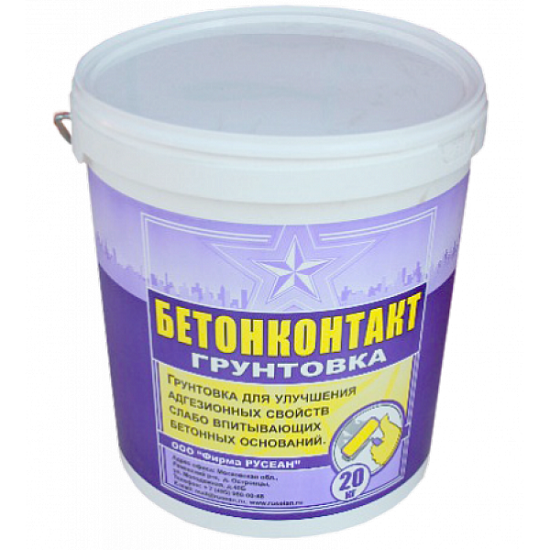 Грунтовка Русеан Бетонконтакт – грунтовка для улучшения адгезионных свойств слабо впитывающих бетонных оснований. Предназначена для обработки бетонных поверхностей перед нанесением штукатурок, шпатлевок, полов и клеев. Применяется для внутренних работ. Состав: водная акриловая дисперсия с минеральным наполнителем. Особенности грунтовки Русеан Бетонконтакт: нанесение грунтовки необходимо производить после очищения поверхности от пыли, старых покрытий, масел, красок; нанесение грунтовки должно осуществляться широкой кистью равномерным слоем за один проход; полное высыхание грунтовки при комнатной температуре составляет 3 часа; возможно 4-х кратное замораживание и оттаивание зимней грунтовки. Основой грунтовки является концентрированный состав, состоящий из водной дисперсии и специальных химических добавок. После нанесения и высыхания грунтовки на поверхности образуется тонкий слой, не впитывающий влагу и повышающий адгезию отделочных материалов, которые впоследствии будут наноситься на поверхность. Нанесение осуществляется равномерным слоем из расчета 200-300 г на один м2. Расход зависит от впитывающей способности основания.