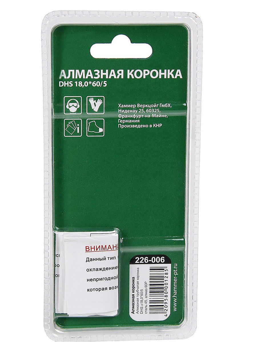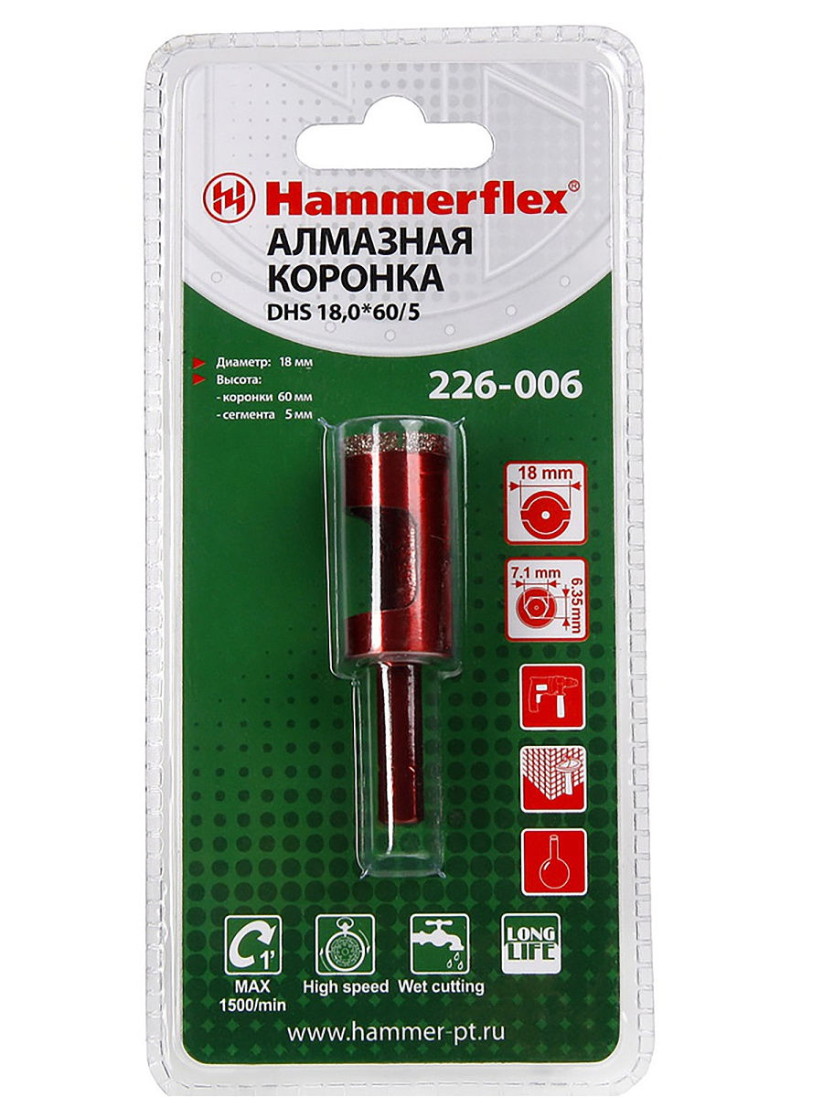 Коронка HAMMER Flex 226-006 алмазная трубчатая, керамогранит, DHS 18,0x60/5, A3, алмаз 60Р