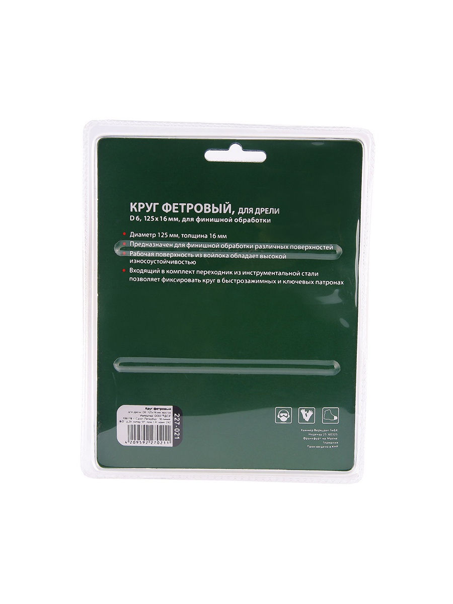 Особенности: Фетр для обработки металлических либо стеклянных поверхностей; Применяется при работе с дрелью; Входящий в комплект переходник из инструментальной стали позволяет фиксировать круг в быстрозажимных и ключевых патронах. Технические характеристики: Диаметр: 125 мм.; Толщина: 16 мм.; Материал: фетр; Крепление: хвостовик 6 мм; Применение: для дрели. Комплектация: Переходник; Диск полировальный. Состав: абразивное полотно 100%