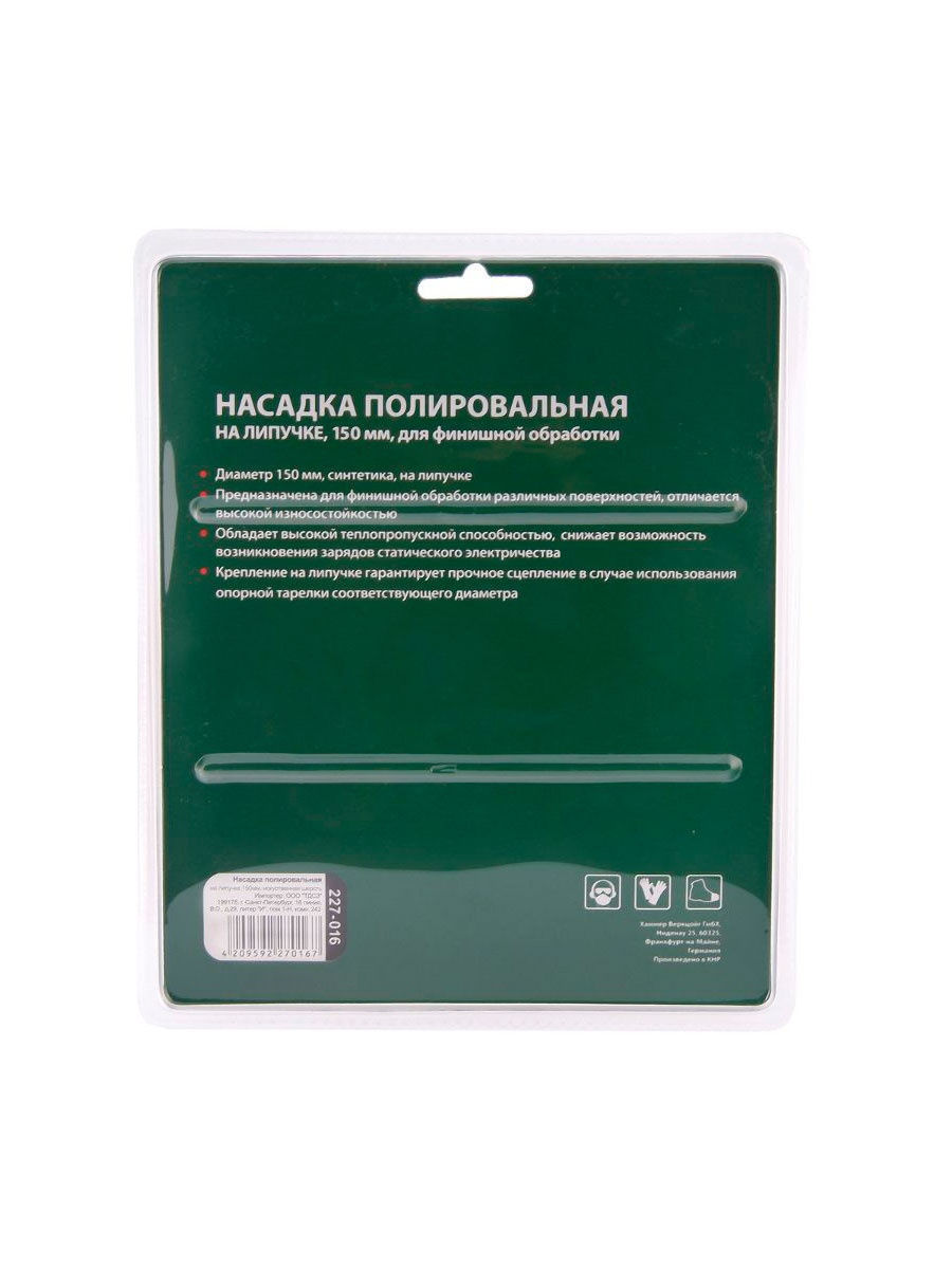 Особенности: Шерсть дляфинишной деликатной обработки поверхности до зеркального блеска; Используется совместно с опорной тарелкой; Отличается высокой износоустойчивостью; Обладает высокой теплопропускной способностью, снижает возможность возникновения зарядов статического электричества; Использование завязок позволяет закреплять круг на опорной тарелке без липучки. Технические характеристики: Диаметр: 150 мм.; Материал: шерсть; Крепление: на липучку (Velcro); Применение: для УШМ/дрели; Количество в упаковке: 1 шт. Состав: абразивное полотно 100%