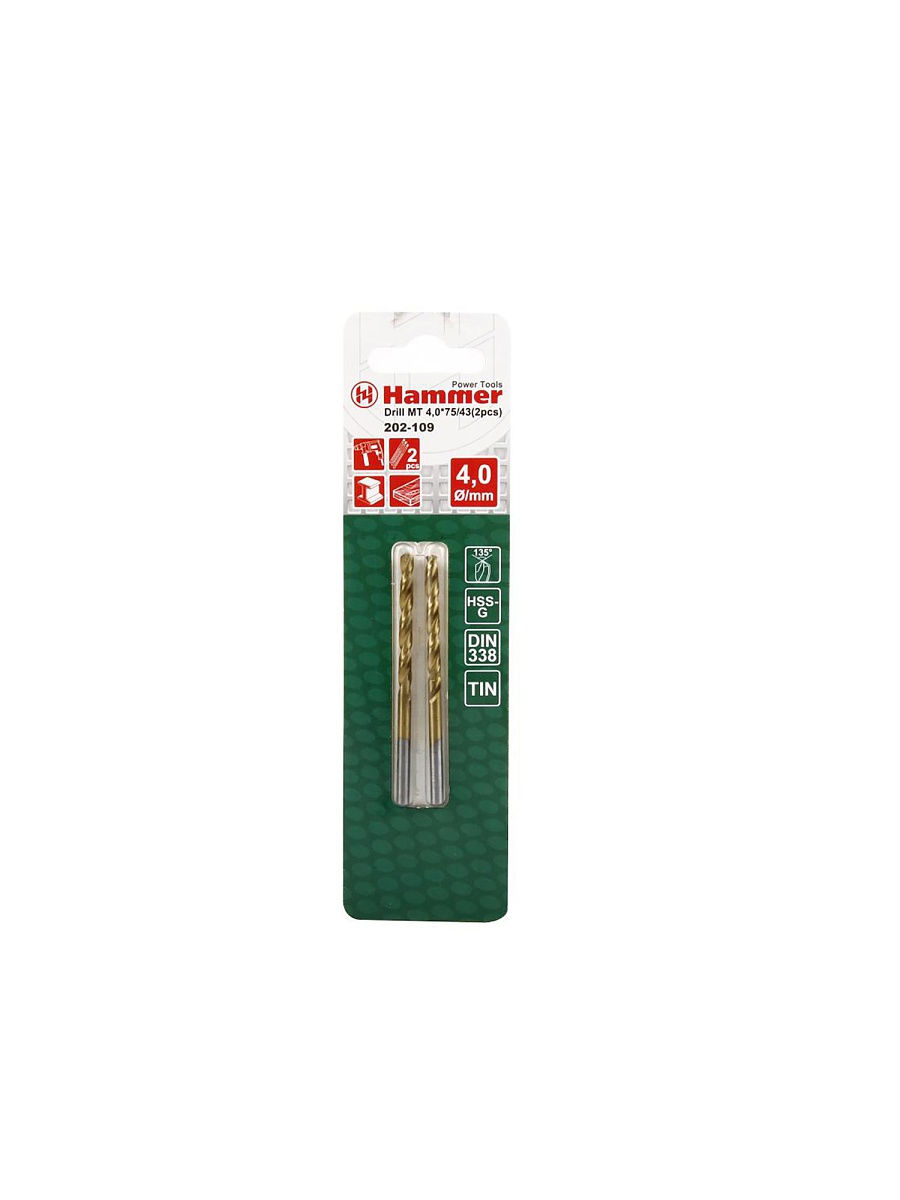 Сверло HAMMER Flex 202-109 DR MT 4,0 ммх75/43 мм металл, DIN338, HSS-G, TIN, 2 шт