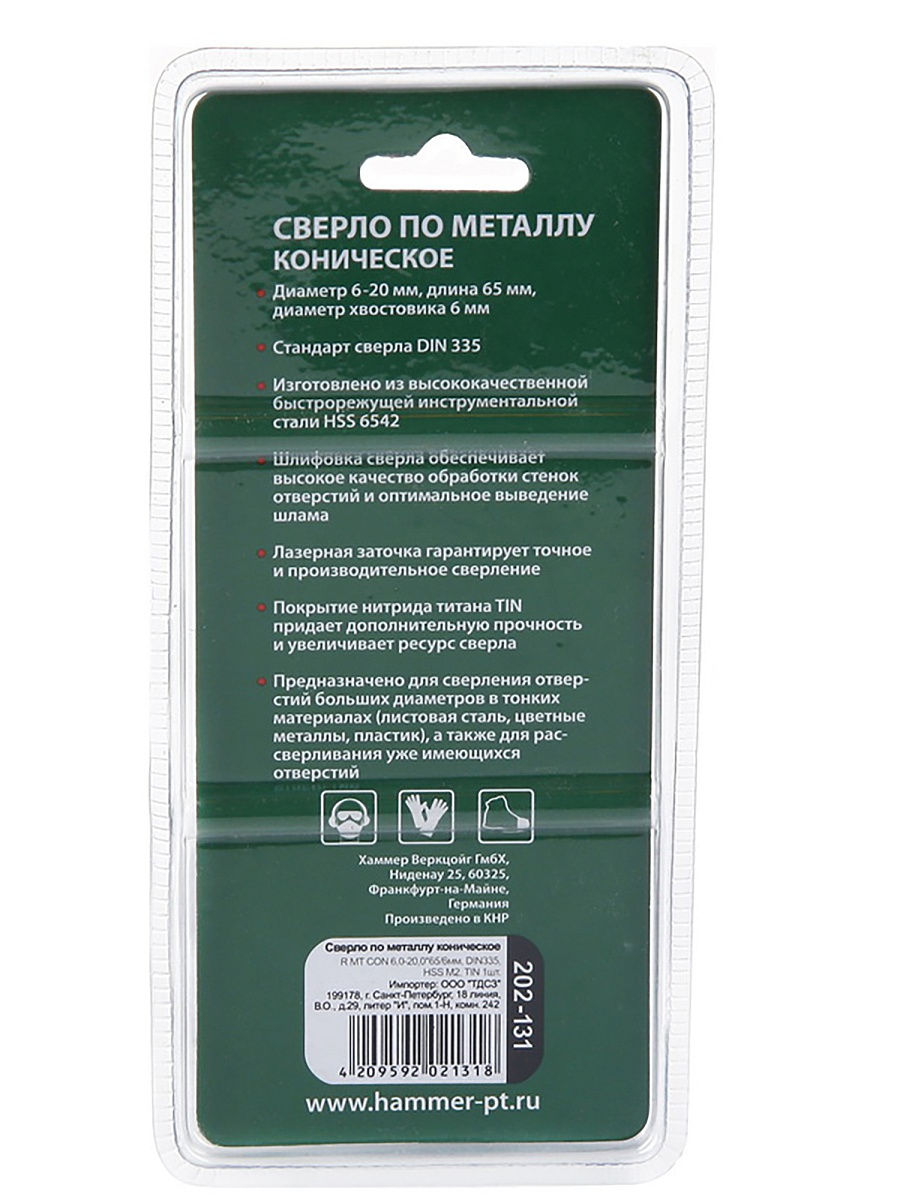 Сверло HAMMER Flex 202-131 DR MT CON 6,0-20,0 ммх65/6 мм металл, коническое, DIN338, HSS M2, TIN