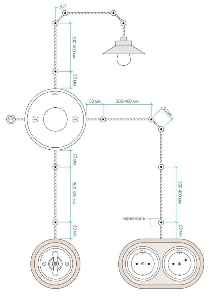 Серия Retro — возможность создать дизайн интерьера в стиле, проверенном временем. Там где обычный провод не подойдет по внешнему виду и качеству, на выручку приходит ретро провод для наружной проводки. С его помощью можно не только решить проблему совместимости дизайна, но даже и улучшить общее настроение в комнатах. Это крепкий и надежный витой кабель, который обладает всеми необходимыми современными свойствами. В основе конструкции декоративного кабеля Werkel лежит медная многопроволочная токопроводящая жила . Поверх жилы находится ПВХ-изоляция. Для упрощения работы изоляция изготавливается разными цветами. Наружная оболочка выполнена из специальных негорючих нитей, которые также называются искусственным шелком, они-то и придают витому проводу стиль ретро. Особенности ретро провода Werkel: Многожильный медный провод обеспечивает гибкость кабеля и его высокие электротехнические характеристики. Наружная оплетка кабеля имитирует натуральный шелк и не поддерживает горение. Декоративно-защитная оплетка из полиэфирной нити придает кабелю эстетичный внешний вид, выгодно отличаясь высокой прочностью и гигиеничностью. Наружная проводка - отличный способ обыграть ваш интерьер в стиле ретро, но для его установки требуется выполнения ряда правил. Правильно произвести монтаж позволит соблюдение ряда простых правил: Рекомендуемое расстояние от распределительной коробки или механизма до первого изолятора – 50 мм. При такой установке провод будет надежно зафиксирован в механизме. Расстояние между всеми изоляторами должно быть одинаковым и сохраняться в пределе от 300 до 400 мм. Это обеспечит эстетичный внешний вид проводки и позволит избежать провисания провода. В местах, где проводка меняет направление, рекомендуется устанавливать два изолятора на расстоянии 50 мм под углом 45° друг к другу. Более надежную фиксацию провода можно обеспечить, если перевязать кабель жгутом над изолятором и под ним. Аккуратный и безопасный вывод кабеля из стены оформляется с помощью специальной втулки. Она не позволит проводу перетереться и обеспечит эстетичный внешний вид отверстия. Розетки и выключатели Retro рассчитаны на подключение проводов сечением 0,75–2,5 мм². Для подключения розеток чаще всего используется кабель сечением 2,5 мм², для освещения подходит витой кабель сечением 1,5 мм². Продуманная конструкция рамок серии Retro обеспечивает возможность как горизонтального, так и вертикального монтажа. Рамки оснащены специальной разметкой для организации пазов, которые позволяют подвести кабель к каждому механизму с любой стороны.