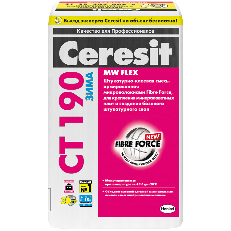 Смесь Ceresit CT 190 Зима предназначена для приклеивания минераловатных плит и устройства защитного армированного слоя при утеплении фасадов зданий и сооружений, не отапливаемых в период выполнения работ. Ceresit CT 190 Зима является составной частью системы утепления наружных стен зданий Ceresit на базе минераловатных плит. Применяется при утеплении стен по кирпичным, бетонным, оштукатуренным и другим минеральным поверхностям новых зданий, а также зданий, находящихся в эксплуатации. Преимущества клея для теплоизоляции Ceresit CT 190 Зима: может применяться при температуре от –10°C; обладает высокой адгезией; содержит армирующие микроволокна; эластифицированный; ударопрочный; паропроницаемый; морозо- и атмосферостойкий; экологически безопасна.