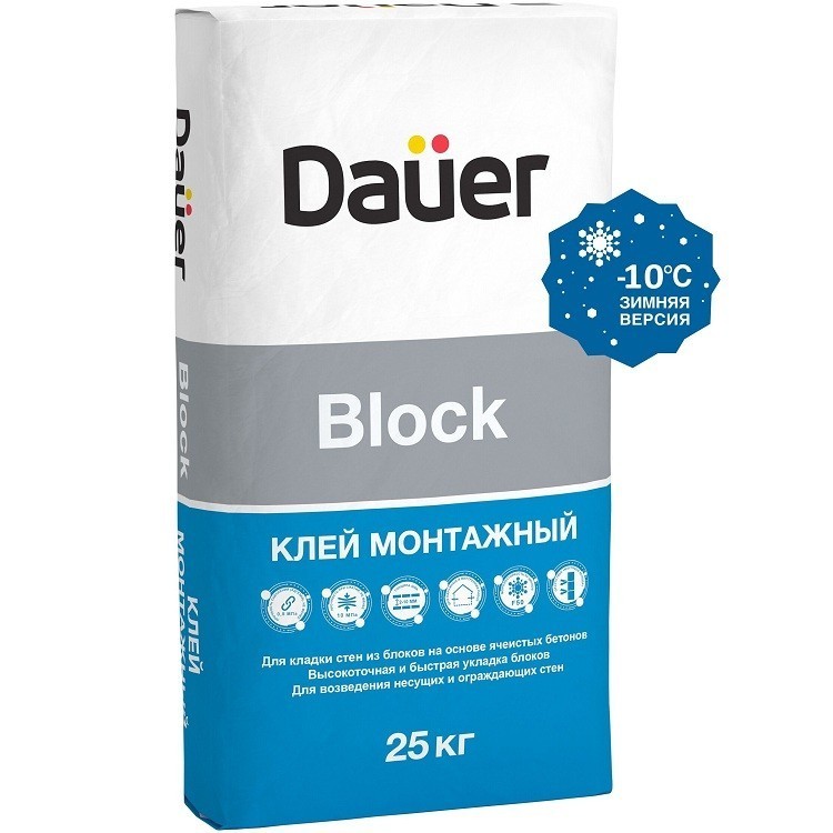 Монтажный клей Dauer Block Зима предназначен для кладки несущих и ограждающих стен, а также перегородок из блоков на основе ячеистых бетонов (пенобетон, газобетон, пеносиликат, газосиликат и т.п.). Применяется для кладки блоков на основе легких заполнителей, таких как керамзитобетон и пенополистиролбетон. Наносится слоем от 2 мм, предотвращая возникновение мостиков холода между блоками. Особенности монтажного клея Dauer Block: Для кладки стен из блоков на основе ячеистых бетонов. Обладает высоким водоудержанием и пластичностью. Позволяет осуществлять кладку быстро с высокой точностью. Применяется для наружных и внутренних работ. Для возведения несущих и ограждающих стен. Монтажный клей Dauer Block Зима может применяться при температуре от -10 °С до +35 °С. Для затворения смеси рекомендуется использовать воду, подогретую до температуры от +20 °С до + 30 °С. Перед проведением работ предварительно прогреть основание при помощи газовой горелки или тепловой пушки. Работы допускается производить при температуре воздуха, готовой стены и блоков не ниже -10°С. Не рекомендуется проводить работы при сильном ветре и снеге. Свежеуложенный слой материала необходимо защищать от воздействия осадков. Рекомендуется установить леса, обшитые укрывным материалом. Внимание! При работе с материалом зимней версии при нормальных температурах возможно уменьшение жизнеспособности раствора в таре и на основании! При работе с материалом зимней верси следует учитывать замедленный рост прочностных характеристик материала. Материал изготовлен на основе высококачественного цемента, фракционированного песка, минерального наполнителя и модифицирующих добавок. Материал экологически безопасен, не содержит вредных примесей, оказывающих отрицательное воздействие на здоровье человека. Соответствует действующим на территории Российской Федерации гигиеническим нормам.