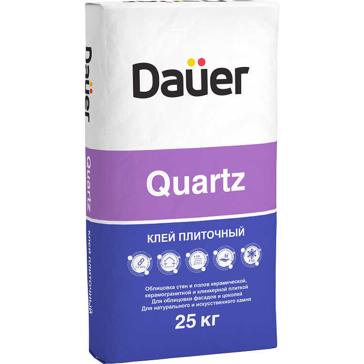 Клей Dauer Quartz представляет собой клей для укладки на пол и стены всех видов керамической плитки, керамогранитных и клинкерных плиток, гранита, а также плит из натурального и искусственного камня. Применяется для облицовки фасадов, цоколей, подвалов, балконов и террас, а также в отапливаемых и неотапливаемых помещениях с любым уровнем влажности. Используется для облицовки крытых и открытых бассейнов, а также при устройстве полов в помещениях с низкой, умеренной и высокой нагрузкой. Рекомендуется к применению в системах полов с подогревом любого типа. Особенности плиточного клея Dauer Quartz: Подходит для облицовки сложных оснований. Облицовка полов с высокой проходимостью. Для облицовки фасадов и цоколей. Подготовка основания. Перед нанесением материала необходимо удалить с поверхности пыль, масляные пятна и другие загрязнения, препятствующие сцеплению материала с поверхностью. Гладким бетонным поверхностям и поверхностям, окрашенным или облицованным плиткой, необходимо придать дополнительную шероховатость путем создания насечек на поверхности или обработки абразивным материалом. Значительные неровности необходимо выровнять соответствующими материалами Dauer® (в зависимости от типа основания и условий эксплуатации). Для усиления прочности сцепления материала с основанием, поверхность обработать соответствующим грунтом Dauer®. При необходимости, нанести грунт в несколько слоев. Основание готово к нанесению только после полного высыхания грунта. Не допускать запыления загрунтованных поверхностей. Приготовление раствора. Для приготовления раствора содержимое мешка при постоянном перемешивании высыпать в емкость с чистой водой из расчета 1 кг сухой смеси на 0,22-0,24 л воды (на мешок 25 кг – 5,5-6,0 л воды) и перемешать до образования однородной массы. После этого выдержать раствор (дать отстояться) в течение 2-3 минут, затем повторно перемешать. Перемешивание производится с помощью соответствующего инструмента (миксер для растворов, низкооборотистая дрель с насадкой). Раствор можно использовать в течение 4 часов с момента затворения водой. При повышении вязкости раствора в емкости (в пределах времени жизнеспособности) необходимо тщательно перемешать его без добавления воды. Для приготовления раствора использовать только чистые емкости, инструменты и воду. Выполнение работ. С помощью кельмы или шпателя клеевой раствор нанести и равномерно распределить по облицовываемой поверхности. Создать гребенчатый слой при помощи зубчатого шпателя. Уложить облицовочный материал на клеевой слой, прижать его с усилием к основанию, зафиксировать на несколько секунд и откорректировать положение плитки по уровню. Единовременный участок нанесения клея выбирается исходя из того, что последняя плитка должна быть уложена и положение ее откорректировано в течение 20 минут после нанесения раствора на основание. Рекомендуемая толщина клеевого слоя в зависимости от типа основания, размера плитки и эксплуатационных нагрузок, составляет от 2 до 15 мм. При облицовке фасадов, полов, особенно при работе с керамогранитом и натуральным камнем, для обеспечения беспустотной укладки рекомендуется дополнительное нанесение сплошного клеевого слоя на монтажную сторону облицовочного материала. Минимальная прочность, достаточная для ходьбы по поверхности