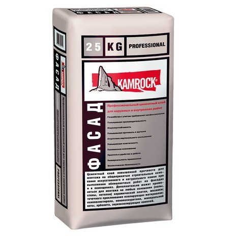Клей для камня KR Professional Professional Фасад 25 кг - универсальный материал для внутренних работ. Данный цементный клей предназначен в первую очередь для монтажа искусственного и натурального камня при на общепринятые строительные основания выполнении облицовочных работ на фасадах и в помещениях. Может использоваться для работы с керамической плиткой, мозаикой, а также для точечного приклеивания изолирующих материалов, минеральной ваты, арболита, звукоизолирующих панелей, пенополиуретана, пенополистирола. Обладает морозоустойчивостью, позволяет сделать укрепленную и герметичную кладку, дает чистый и аккуратный шов. Клей позволяет снизить расходы на ремонт и отличается при этом профессиональным качеством. Преимущества: простота и удобство в работе; экологическая безопасность; универсальность применения.