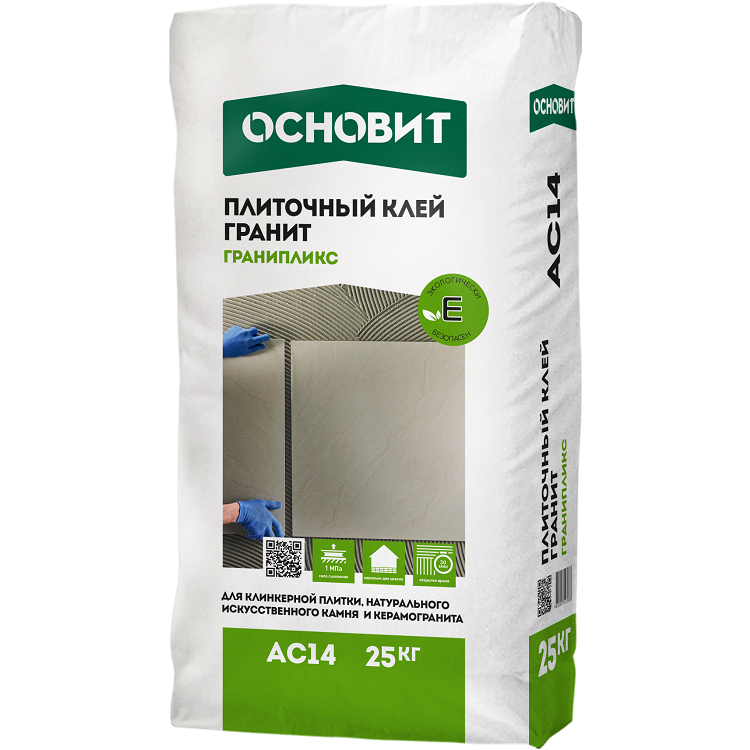 Клей для плитки Основит Гранипликс AC14 беспылевой предназначен для укладки тяжелых плит из керамогранита, натурального камня, искусственного камня (клинкерная плитка) и керамической плитки (вес до 800 г / 100 см²). Используется для облицовки искусственных водоемов, чаш бассейнов, каминов. Рекомендуется для облицовки балконов, террас, цоколей, фасадов, полов с подогревом. Можно использовать для приклеивания теплоизоляционных плит (кроме экструдированного пенополистирола). Подходит для внутренних и наружных работ. В качестве основания рекомендуются стандартные (бетонные, оштукатуренные, кирпичные) и сложные недеформирующиеся основания (пено- и газобетон, ГКЛ и ГВЛ, ЦСП, старая плитка и другие поверхности). В плиточном клее Основит Гранипликс AC14 пылеобразование снижено более чем на 90%. Свойства клея для плитки Основит Гранипликс AC14: Водостойкость материала повзоляет использовать его для облицовки искусственных водоемов, чаш бассейнов. Увеличенная жизнеспособность клеевого раствора способствует удобству в работе. Хорошая адгезия клея к различным основаниям обеспечивает надежность и долговечность плиточной облицовки. Клей сохраняет свои свойства при попадании влаги и при воздействии отрицательных температур. Ранее продукт выпускался под названием Основит Гранипликс Т-14