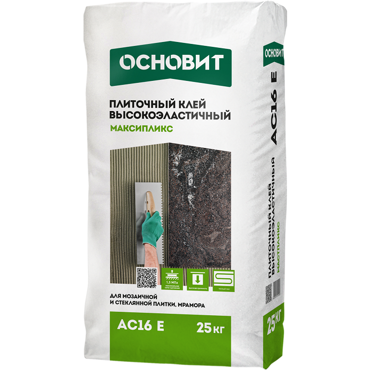 Клей для плитки Основит Максипликс АС16 Е предназначен для облицовки стен и пола керамической плиткой и керамогранитом, плитами из мрамора и гранита, натуральным и искусственным камнем (клинкерная плитка). Используется для работы по сложным и подвергающимся деформации в ходе эксплуатации основаниям. Особенно рекомендуется для облицовки фасадов, чаш бассейнов, укладки крупноформатной плитки. Применяется для облицовки резервуаров с водой, искусственных водоемов, каминов, балконов, террас, цоколей, фасадов, полов с подогревом, полов с высокой эксплуатационной нагрузкой. Подходит для внутренних и наружных работ. В качестве основания рекомендуются бетонные, в том числе молодой бетон (< 3 мес.), оштукатуренные, кирпичные основания, пено- и газобетон, ГКЛ и ГВЛ, ЦСП, старая плитка, краска, гидроизоляция, а так же дерево, фанера, ДСП внутри помещений. В плиточном клее Основит Максипликс АС16 Е пылеобразование снижено более чем на 90%. Преимущества клея Основит Максипликс АС16 Е: Высокая эластичность клея обеспечивает надежное крепление плитки на сложных и деформирующихся основаниях: старая плитка, линолеум, краска, молодой бетон, гидроизоляция, дерево, ДСП и т.д. Высокая прочность сцепления с основанием гарантирует надежность и долговечность плиточной облицовки. Пластичность готового раствора обеспечивает удобство работы с материалом. Низкий расход клея и работа в тонкий слой позволяет снизить затраты на плиточную облицовку. Клей сохраняет свои свойства при попадании влаги и при воздействии отрицательных температур.