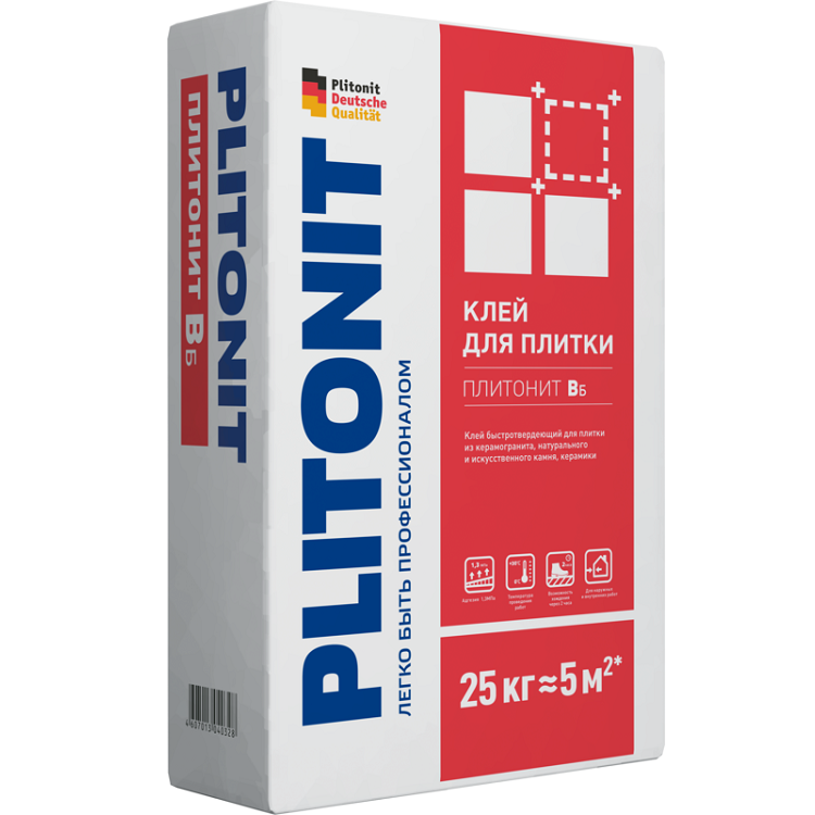 Клей Plitonit В экспресс предназначен для приклеивания всех типов облицовочной керамической, керамогранитной и клинкерной плитки, плитки из натурального и искусственного камня на поверхности стен и полов из бетона, железобетона, ячеистого бетона, кирпича, гипсокартона, цементных, известково-цементных и гипсовых штукатурок при проведении внутренних и наружных работ. Применяется при необходимости срочной сдачи объекта в эксплуатацию. Может использоваться для облицовки полов с подогревом и бассейнов объемом не более 180 м³. Клей обладает широкой сферой применения, высокой пластичностью, водо- и морозостойкостью, удобен в использовании. В процессе производства работ плитка не сползает с вертикальных оснований, что позволяет производить облицовку в любом направлении, в том числе «сверху вниз». Особенности клея для плитки Plitonit В экспресс: Рекомендован для срочной сдачи объекта в эксплуатацию. Возможность хождения и затирки швов через 2 часа. Возможность проведения облицовочных работ до 0ºС. Лёгкость при замешивании и нанесении. Высокая прочность сцепления. Высокая фиксация плитки на вертикальном основании. Температура клеевого шва в процессе эксплуатации — до +70ºС.Максимальная толщина клеевого шва — 20 мм.Максимальная фракция наполнителя — 0,63 мм. При проведении работ и в течение последующих 3 суток, температура воздуха, основания и плитки должна быть в пределах от +0ºС до +30ºС. Температура растворной смеси в процессе проведения работ должна быть от +10ºС до +30ºС. Поверхность при производстве наружных работ необходимо защитить от атмосферных осадков. Подготовка основы. Основание под облицовку должно быть прочным, очищенным от грязи, пыли, масел, жиров, а также отслаивающихся элементов. Гипсовые основания и поверхности с высоким водопоглощением, перед началом облицовочных работ, необходимо обработать грунтовкой (лучше «Плитонит Грунт»). Дальнейшие работы выполняются после полного высыхания грунтовки. Приготовление растворной смеси. Для затворения сухой смеси необходимо использовать воду из питьевого водоснабжения. Соотношение при смешивании: на 1 кг сухой клеевой смеси требуется 0,20-0,24 л воды (5-6 л на 25 кг). Сухую смесь засыпать в заранее отмеренное количество воды комнатной температуры и перемешать в течение 2-3 минут с помощью электромиксера или электродрели с насадкой, с частотой вращения не более 600 об/мин, до получения однородной консистенции. Дать растворной смеси отстояться 5 минут и повторно перемешать. При повторном перемешивании разрешается добавление воды до максимального значения вышеуказанного соотношения. Время использования готовой растворной смеси – не более 40 минут (сквозняки и высокая температура уменьшают это время). Порядок работы. Готовую растворную смесь равномерно нанести на основание с помощью гладкого шпателя и придать гребенчатую структуру зубчатым (размер зубцов шпателя зависит от размера и типа плитки). Растворную смесь следует нанести на такую площадь, которую можно облицевать плиткой в течение 15 минут (открытое время работы). Плитку уложить на клеевую растворную смесь и небольшими поворотными движениями вдавить в нее. Положение плитки может быть скорректировано в течение последующих 15 минут. Сквозняки, высокая температура, а также сильная впитываемость поверхности снижают открытое время 