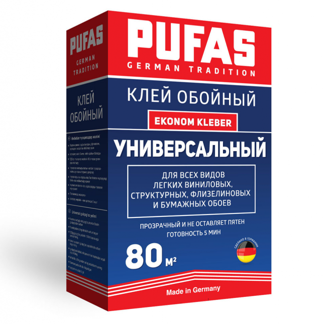 Клей обойный Pufas Ekonom Kleber Универсальный представляет собой быстрорастворимый обойный клей. Применяется для различных типов обоев: бумажные, виниловые, флизелиновые и структурные. Он подходит для наклеивания всех видов бумажных обоев от лёгких до тяжёлых, а также лёгких виниловых на все минеральные основания, такие как гипсовая, известковая и цементная штукатурка, бетон, гипсокартонные плиты и т.п. Сырьевая основа: модифицированный крахмал, добавки. Преимущества клея Pufas Ekonom Kleber Универсальный: Готов к применению через 5 минут. Высыхает прозрачным. Продолжительный срок хранения – 5 лет. Расход пачки до 80 м². Применение. Основание должно быть чистым, сухим, гладким, твёрдым и без разделительных веществ. Сильновпитывающие и меловые основания предварительно обработать грунтовкой глубокого проникновения. Перемешивать воду до образования воронки. Не переставая перемешивать, маленькой струйкой всыпать содержимое упаковки в центр воронки, продолжая помешивать ещё пол минуты. Выдержать 5 минут, тщательно перемешать. Клей готов к применению. Намазать полосы обоев клеем, сложить пополам и дать пропитаться, затем приклеить встык. Обязательно необходимо соблюдать предписания изготовителя обоев. Хранить клей в прохладном месте. Беречь от сырости!