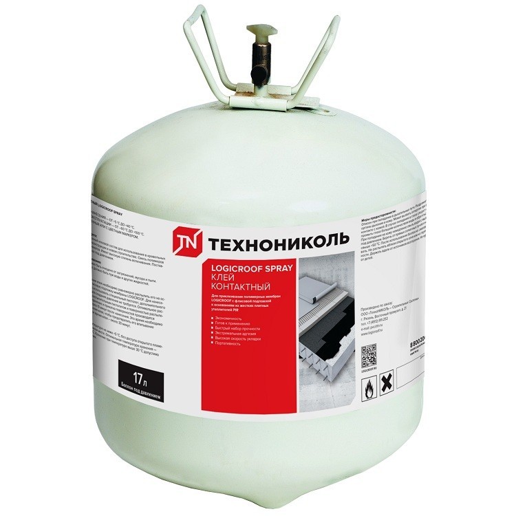 Контактный клей Технониколь Logicroof Spray представляет собой высококачественный клеевой состав на полиуретановой основе для приклейки кровельных изоляционных материалов. Применяется для приклейки полимерной мембраны с флисовой подложкой к основанию из бетона, старого битумного ковра, жестких плитных утеплителей из PIR с кашированием из стеклохолста. Клеевой состав быстро формирует пленку, позволяя достичь высокой адгезии при одностороннем нанесении клея на плиты Logicpir и, при этом, не впитываясь во флис мембраны. Для облегчения работы в состав клея может добавляться краситель сигнального цвета (зеленый, красный, синий). Расход – 1 баллон на 170 м2. Преимущества Технониколь Logicroof Spray: Технологичное решение. Распыление клея происходит за счет предварительно закачанного в баллоны газа — нет необходимости использовать компрессоры и другую технику для распыления клея. Сверхмалый расход. По сравнению с системами механического нанесения клея расход в 2-3 раза ниже! Экологичность. Клей не имеет запаха и абсолютно безопасен для кровельщиков. Удобно работать. Баллоны легко переносятся одним человеком, нет привязки к источникам электричества, процесс приклеивания легко начинается и заканчивается – просто поверни кран! "Решение под ключ". Клей однокомпонентный, не требует никакой предварительной подготовки, перемешивания и других действий, высокое качество гарантировано заводским контролем. Применение. Для использования контактного клея Logicroof Spray, необходимо равномерно распылить его по обеим высушенным и очищенным поверхностям приклеиваемых материалов. Для распыления необходимо использовать специальный пистолет, дополнительного оборудования для создания давления не требуется. Оптимальное расстояние между распылительным пистолетом и поверхностью распыления – 30 см. После приклеивания мембрану желательно прикатать при помощи валика. Диапазон температур применения от +5°С до +40°С. Диапазон температур эксплуатации – от -60°С до +100°С. Время полной полимеризации клея при стандартных условиях не более 24 ч. Не применять вблизи источников открытого огня. Избегать попадания на кожу и в глаза. Хранить в сухом, защищенном от света и влаги месте при температуре от +5°С до +30°С.