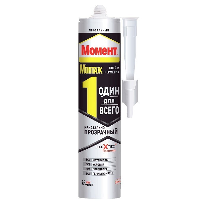 Момент Монтаж Один для Всего кристально прозрачный - совершенно прозрачный однокомпонентный, эластичный, многофункциональный конструкционный клеящий состав для внутренних и наружных работ, на основе технологии Flextec®. Подходит для экстренной герметизизации и склеивания даже под водой. Продукты на полимере Flextec – запатентованной технологии Henkel, основанной на гибких полимерных цепях, устойчивых к постоянным ударным и вибрационным нагрузкам, а также к любым атмосферным воздействиям. Подходит для всех типов материалов! Может применяться во всех условия! Склеивает всё! Особенности: Мгновенное схватывание Возможность подгонки в течение нескольких минут Отверждение под действием влаги Для внутренних и наружных работ Подходит для разных материалов Герметизирующие свойства Возможность окрашивания и шлифовки после отверждения Возможность заполнения зазоров Атмосферостойкий и износостойкий Возможность нанесения на влажные поверхности Область применения: Совместим с разными подложками, включая кирпич, керамику, бетон, ДВП, гипсокартон, фанеру, камень, МДФ, дерево, металл, НПВХ, стекло, пластмассы, окрашенные поверхности и зеркала. Подходит для склеивания всех абсорбирующих и неабсорбирующих подложек. Исключение составляют ПЭ, ПП, ПТФЭ, акриловое стекло, пластифицированный ПВХ, медь и латунь. Герметизация соединений и швов в металлических и деревянных конструкциях. Соединения в системах труб для устройств вентиляции и кондиционирования воздуха.