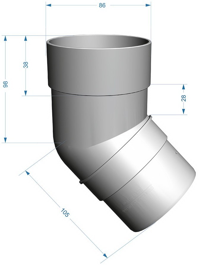 Колено трубы 45 градусов Docke Premium 120/85 Пломбир - элемент водосточной системы, предназначенный для обеспечения перехода от воронки к трубе. Применяется также для обхода архитектурных элементов фасада. Классическая, проверенная временем водосточная система Döcke Premium разработана немецкими инженерами специально для малоэтажного строительства. Именно она стала своеобразным эталоном рынка. Данную систему рекомендуется устанавливать на дома с площадью кровли от 150 до 250 м2. Особенности водостоков серии Premium: Диаметр желоба: 120 мм. Диаметр трубы: 85 мм. Толщина стенок: 1,8 мм. Пропускная способность желоба: 1,8 л/сек на п.м. Пропускная способность трубы: 6,4 л/сек. Система соединения элементов: на уплотнителях, без клея и герметика. Уплотнители: из силиконизированной резины, сохраняют свойства при любых температурах, не рассыхаются. Уникальные запатентованные ограничители монтажа (Патент на изобретение № 2439259). Уникальный универсальный хомут, позволяющий крепить как трубу, так и фитинги (Патент на изобретение № 2413895). Уникальное крепление желоба с регулируемым углом наклона. Желоб способен восстанавливать форму после механического воздействия. Преимущества водостоков Docke из ПВХ: Универсальность. Водосточные системы Docke предназначены для обеспечения водоотвода с кровель разных типов. Ваш дом всегда будет прекрасен! Простота монтажа водосточных систем Docke – одно из основных их преимуществ. В Döcke эта простота доведена до совершенства. Продуманная конструкция, внятные и доступные инструкции и обычные инструменты – ещё никогда монтаж водосточной системы не был таким простым. Пластиковые водостоки не подвержены коррозии, плесени и грибку. Высокая стойкость цвета, в том числе под действием прямых солнечных лучей. Конструкция почти не создает дополнительной нагрузки на фасад здания. Водостоки ПВХ бесшумны, трубы не гудят даже во время сильного ливня. Все изделия изготавливаются с применением современного оборудования и технических решений. Каждый экземпляр водосточных систем проходит строгую техническую экспертизу и краш-тесты на механическую прочность, морозоустойчивость, огнеупорность. Водосточные системы, помимо своей основной функции – отвода осадков с кровли, выполняют и декоративную функцию. Водосточные системы Docke производятся в цветах, которые подобраны в соответствии с законами цветовой гармонии и идеально сочетаются как с другими материалами Docke, так и с любыми традиционными строительными и отделочными материалами. Вы можете выбрать водосточную систему, гармонирующую с фасадом, или подчеркнуть контуры вашего дома контрастной водосточной системой. Ваш дом всегда будет прекрасен!