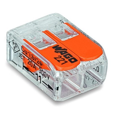 Миниатюрный соединительный клеммник на два провода с нажимными рычагами и прозрачным корпусом. Для подключения тонких проводов от 0,25мм.кв. Клемма Wago 221-412 является незаменимой при монтаже разделительных коробок, электрических щитов и других электро систем. С помощью клемм можно быстро и качественно, а главное надежно зафиксировать соединение группы проводов. Малогабаритные размеры упрощают скрытый монтаж, при котором легко демонтировать соединение в случае ремонта сети, при помощи многоразовой рычажковой системе зажима проводников. Клеммная колодка предназначена для соединение двух проводов. Можно использовать как одножильные так и многожильные провода. Преимущества клеммника Wago: Требует небольшого усилия при открывании и закрывании. Не бьёт по пальцам при закрывании! Компактный. Прозрачный корпус позволяет контролировать правильность положения и глубину захода провода, а также видеть правильность длины снятия изоляции. Основные характеристики: Тип устройства: Самозажимный Номинальный ток: 32А Минимальное сечение провода: 0,25мм² Максимальное сечение провода: 4,0мм² Количество контактов: 2 Тип зажима: Нажимной рычаг