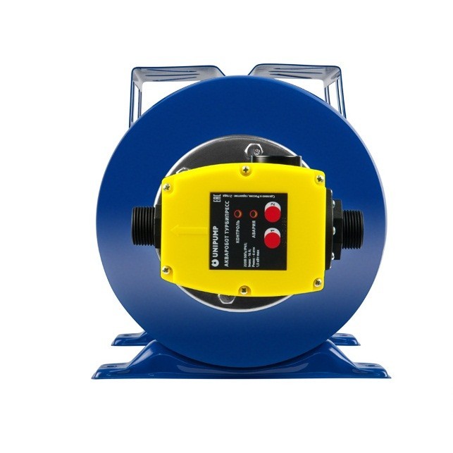 Комплект автоматики Unipump Акваробот Турбипресс с блоком автоматического управления и гидроаккумулятором 24 л предназначен для автоматического управления однофазными поверхностными и погружными насосами мощностью до 2,2 кВт. На корпусе гидроаккумулятора имеется ниппель для регулирования давления воздуха. Функциональные возможности комплекта автоматики Unipump Акваробот Турбипресс: Автоматически управляет работой насоса, поддерживая в системе водоснабжения заданные пользователем пороги минимального и максимального давления – Рмин и Рмакс. Выключает насос при отсутствии потока воды. Переводит его в режим аварии при «сухом ходе», заклинивании насоса и в других аварийных ситуациях. Автоматически выключает насос в случае, если давление в системе достигло предельной величины Рпред (5,5–7 атм), и автоматически переводит насос в рабочий режим при снижении давления до величины, ниже Рпред. Обеспечивает устойчивую работу насоса при пониженном напряжении сети – до 170 В.