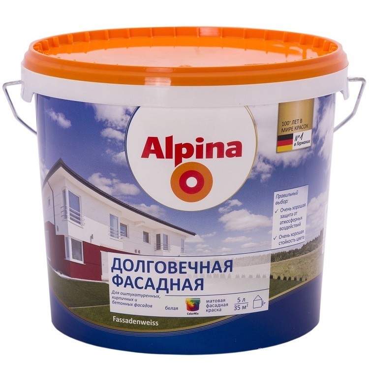 Краска Alpina Долговечная фасадная - это оптимальное решение для долговременной защиты Вашего дома от ветра и погодных воздействий. Эту матовую и грязеотталкивающую дисперсионную краску можно легко использовать почти на всех основаниях. Заодно при покраске будут выравнены небольшие неровности штукатурки. Краска Alpina Долговечная фасадная водоотталкивающая и предотвращает тем самым проникновение влаги в стены, будь то штукатурка, кирпич или бетон. Вы можете оформить Ваш дом согласно любым цветовым представлениям, не отказываясь при этом от ярких акцентов. Alpina Долговечная фасадная поможет Вам в этом, предоставив большое разнообразие оттенков. Продукт имеет очень хорошую укрывистость и сохраняет цвет в течение длительного времени. Эффективно защищает от ветра и непогоды - для долговечных оштукатуренных, кирпичных и бетонных фасадов Обратите внимание! База 1 может применяться как белая краска или заколерованная в один из многочисленных светлых оттенков вручную с помощью колорантов Alpina Kolorant или Alpina Tint, а также машинным способом с помощью Alpina ColorMix. Преимущества краски фасадной: Атмосферостойкая. Водоразбавляемая. Экологически чистая. Легко наносится. Препятствует проникновению влаги. Высокопаропроницаемая (класс V1 согласно DIN EN 1062). Применение: Известково-цементные штукатурки, бетон, силикатный и облицовочный кирпич, старые матовые дисперсионные краски и дисперсионные штукатурки. Подложки должны быть прочными, чистыми, сухими, обладать несущей способностью и не содержать веществ, препятствующих адгезии. Основания с легкой осыпью или сильно впитывающие необходимо 1-2 раза предварительно прогрунтовать Грунтовками Alpina. Новые известково-цементные штукатурки обрабатывать только через 2-4 недели. Перед использованием тщательно перемешать, нанести краску в 2 слоя. Краску для первого слоя разбавить не более чем 10 % воды, краску для второго слоя нанести неразбавленной или, при необходимости, разбавить макс. 5 % воды. Способ нанесения: кистью, валиком или краскопультом. Легко наносится. Не наносить при температуре подложки и воздуха ниже + 5 °C. После использования инструменты вымыть водой с мылом. При температуре +20 °C и относительной влажности воздуха 65 % поверхность высыхает через 4-6 часов; через 12 часов можно наносить следующий слой краски. При более низких температурах и более высокой влажности время высыхания увеличивается.