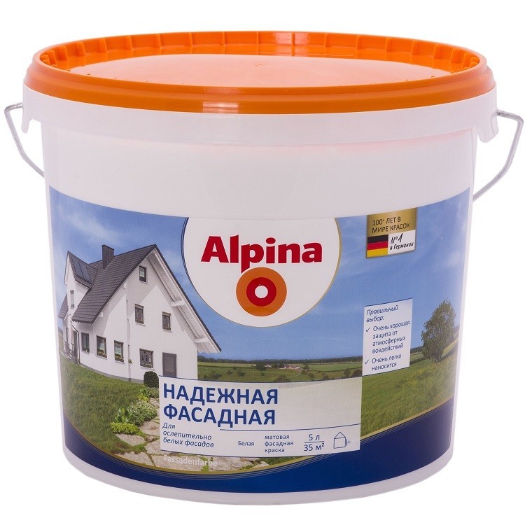 Краска Alpina Надежная фасадная - это матовая дисперсионная краска, поражающая, прежде всего, своей высокой укрывистостью и невероятной простотой в нанесении. Краска обладает однородной структурой и является гарантом прочной и долговременной защиты поверхностей, подвергаемых большим нагрузкам. Не важно, какой цвет Вы выберете — сияющий белый или заколерованный вручную Ваш любимый оттенок, Alpina Надежная фасадная — это высококачественный и простой в работе продукт, который надолго и самым надёжным образом защитит Ваш дом от ветра и непогоды. Колеруется вручную в один из многочисленных светлых оттенков с помощью колорантов Alpina Kolorant или Alpina Tint. Преимущества краски Надежной фасадной: Атмосферостойкая. Водоразбавляемая. Экологически чистая. Легко наносится. Препятствует проникновению влаги. Высокопаропроницаемая (класс V1 согласно DIN EN 1062) . Равномерная структура. Применение: Известково-цементные штукатурки, бетон, силикатный и облицовочный кирпич, старые матовые дисперсионные краски и дисперсионные штукатурки. Подложки должны быть прочными, чистыми, сухими, обладать несущей способностью и не содержать веществ, препятствующих адгезии. Основания с легкой осыпью или сильно впитывающие необходимо 1-2 раза предварительно прогрунтовать грунтовками Alpina. Новые известково-цементные штукатурки обрабатывать только через 2-4 недели. Перед использованием тщательно перемешать, нанести 2 слоя. Краску для первого слоя разбавить не более чем 10 % воды, краску для второго слоя нанести неразбавленной или, при необходимости, разбавить макс. 5 % воды. Наносить кистью, валиком или краскопультом. Легко наносится. Не наносить при температуре подложки и воздуха ниже +5 °C. После использования инструменты вымыть водой с мылом. При температуре +20 °C и относительной влажности воздуха 65 % поверхность высыхает через 4-6 часов; через 12 часов можно наносить следующий слой краски. При более низких температурах и более высокой влажности время высыхания увеличится.