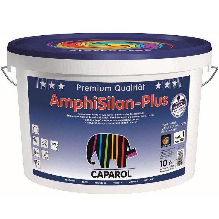 Caparol AmphiSilan-Plus – капиллярно-гидрофобная, минерально-матовая фасадная краска на основе силиконовой смолы. Содержит специальное сочетание силиконовых связующих, наполнителей и пигментов для долговечных, чистых фасадов. Краска концепции чистых фасадов "Caparol Clean Concept". Специальная комбинация силиконовых смол обеспечивает получение отлично водоотталкивающих и открытых для диффузии водного пара фасадных покрытий. Краска предназначена для нанесения на штукатурки и минеральные поверхности, а также для обновляющих покрытий на прочных силикатных и матовых дисперсионных красках, на штукатурках на основе синтетической смолы и на теплоизоляционных композиционных системах. AmphiSilan-Plus объединяет в себе преимущества вододисперсионных красок и классических силикатных красок. Эти свойства позволяют использовать ее также на охраняемых исторических объектах и на штукатурке с большим содержанием извести. Особенности Caparol AmphiSilan-Plus: нетермопластичная; с низкими внутренними напряжениями; не образует пленку; микропористая; пропускает CO2; устойчивая к воздействию агрессивных загрязняющих воздух веществ; высокая степень водоотталкивания благодоря капиллярной гидрофобии; хорошая укрывистость; снижает склонность фасадов к загрязнению. AmphiSilan-Plus колеруется машинным способом по системе ColorExpress во многие тона из известных на рынке цветовых коллекций. AmphiSilan-Plus (база 1) может быть также колерована вручную с помощью красок AmphiSilan Voll- und Abtönfarbe. Во избежание возникновения разницы в цветовых оттенках при самостоятельном колеровании следует колеровать сразу все необходимое количество материала, перемешивая отдельные колерованные партии между собой. Для покраски гладкой поверхности требуется около 150-200 мл/м2, на покраску шероховатых поверхностей расходуется соответствующим образом больше краски. Точный расход определяется путем пробного покрытия. Следующий слой краски можно наносить через 12 часов, полное высыхание занимает 2-3 дня. При более низкой температуре и более высокой влажности воздуха время высыхания увеличивается.