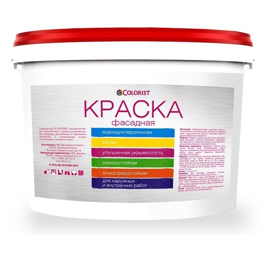 Фасадная краска Colorist – это уникальный отличный материал, с помощью которого можно придать зданию совершенно новый яркий образ в том дизайне, который вам ближе. Кроме того, покраска является своеобразной защитой от воздействия прямых солнечных лучей и осадков. Стены с фасадной краской можно часто мыть, они устойчивы к возникновению микроорганизмов и грибков Краска воднодисперсионная Colorist фасадная - атмосферостойкая акриловая краска с хорошей светоустойчивостью для наружных и внутренних работ. Она хорошо наносится на бетон, штукатурку, кирпич и другие минеральные поверхности. Краска Colorist фасадная обладает хорошей укрывистостью, декоративными свойствами, прочным сцеплением с окрашиваесой поверхностью. Покрытие обладает выносливостью к механическим нагрузкам. Краска наносится на чистую, прочную, сухую поверхность. Наносить ее можно кистью, валиком или распылителем. Для получения желаемого оттенка используются дисперсионные колеровочные пасты. Состав краски воднодисперсионной Colorist фасадной: акриловый латекс; вода; микронизированный мрамор; диоксид титана; целевые добавки.