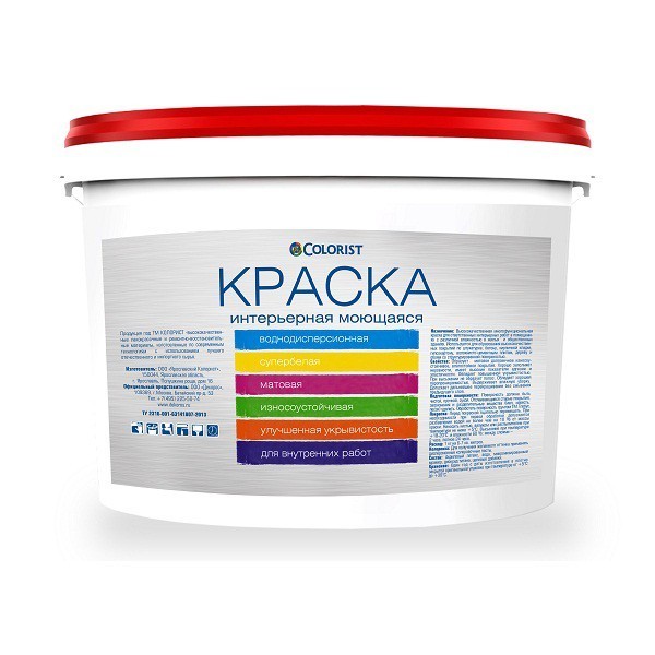 Краска воднодисперсионная акриловая Colorist - высококачественная многофункциональная краска для ответственных интерьерных работ в помещениях с различной влажносью в жилых и общественных зданиях. Используется для образования высококачественных покрытий по штукатурке, бетону, кирпичной кладке, гипсокартону, волокнисто-цементным плитам, дереву и обоям со структурированной поверхностью. Краска воднодисперсионная акриловая Colorist образует матовое долговечное износоустойчивое, влагостойкое покрытие. Хорошо заполняет неровности, имеет высокие показатели адгезии и эластичности, обладает повышенной укрывистостью. При высыхании не образует полос. Данная краска имеет хорошую паропроницаемость, выдерживает влажную уборку. Допускается дальнейшее перекрашивание без смывания предыдущего слоя. Краска наносится на чистую, прочную, сухую поверхность. Наносить ее можно кистью, валиком или распылителем. Для получения желаемого оттенка используются дисперсионные колеровочные пасты. Состав краски воднодисперсионной Colorist: акриловый латекс; вода; микронизированный мрамор; диоксид титана; целевые добавки.
