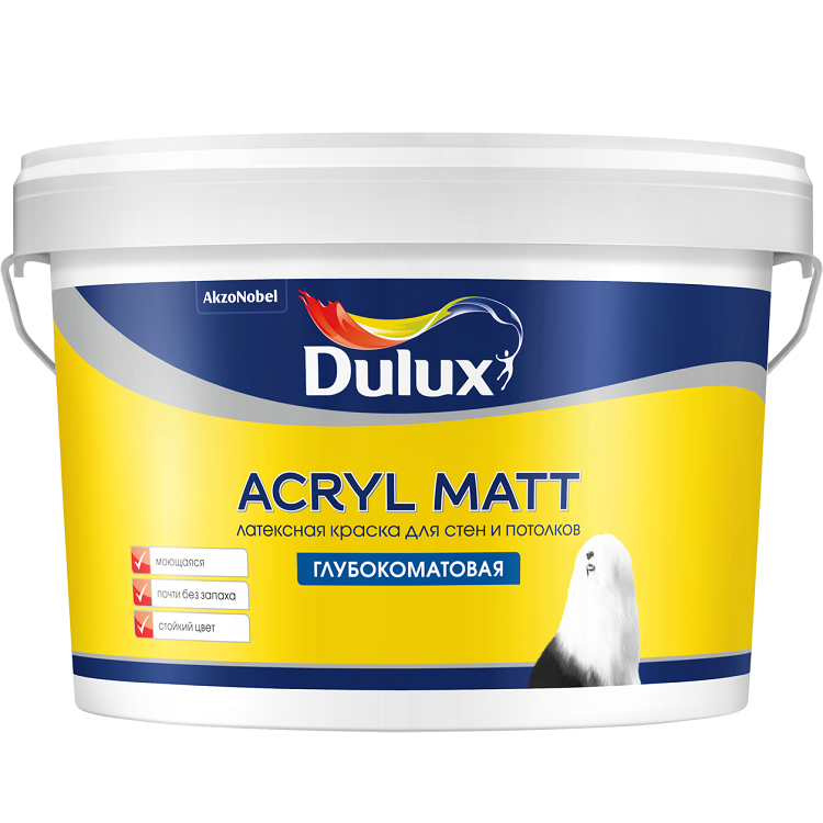 Краска Dulux Acryl Matt – глубокоматовая латексная краска, предназначенная для стен и потолков. Обладает отличной укрывистостью, экономично расходуется, легко наносится без брызг и потеков. Обладает всеми преимуществами акриловой краски: не имеет резкого запаха, образует эластичное покрытие, не изменяет цвет с течением времени. Образует глубокоматовое покрытие, позволяя скрыть небольшие дефекты поверхности. Экологичность подтверждена эко-сертификатом "Листок Жизни". Краска сертифицирована для применения в детских и лечебно-профилактических учреждений. Применяется для внутренних работ. Краска Dulux Acryl Matt подходит для нанесения на полностью просохшие минеральные поверхности (бетон, штукатурка, кирпич и т. п.), гипсокартон, обои под покраску. Рекомендуется для окраски помещений с умеренной влажностью, таких как спальня, гостиная, кабинет, кладовка, столовая, раздевалка и т.п. База BW может применяться самостоятельно как белая краска либо для колеровки в светлые и пастельные тона. Преимущества краски Dulux Acryl Matt: Эластичное покрытие. Высокая устойчивость цвета. Скрывает дефекты поверхности. Допускает влажную уборку. Не имеет резкого запаха. Применение. Поверхность должна быть сухой и чистой. Перед окраской минеральной поверхности и гипсокартона очистите их от пыли, грязи, отслаивающихся частей старого покрытия. Дефекты зашпатлюйте. Ранее окрашенные и зашпатлеванные поверхности ошлифуйте. Для укрепления базовой поверхности, повышения адгезии и уменьшения расхода загрунтуйте подготовленную поверхность грунтовкой Dulux Bindo Base. При использовании другой грунтовки сделайте пробный выкрас на небольшом участке поверхности. Окрашивая обои, убедитесь, что на поверхности не осталось клея. Чтобы обои не отстали, наносите краску не ранее 24 ч после оклейки. Перед применением разбавить в рекомендованной пропорции и тщательно перемешать. Рекомендуется наносить в два слоя при температуре от +5 °C до +30 °C, относительной влажности воздуха от 40 до 80 %. Используйте кисть с синтетическим ворсом, валик для водно-дисперсионной краски или распылитель. По окончании работ максимально очистите инструмент от краски, затем промойте водой.