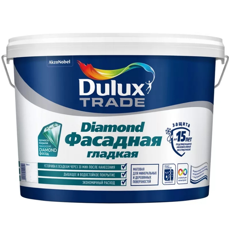 Краска Dulux база BС гладкая - матовая водно-дисперсионная фасадная краска для наружных работ по бетону, кирпичу и другим минеральным поверхностям. Образует прочное атмосферостойкое покрытие с высокой адгезией. Благодаря оптимальному сочетанию паропроницаемости и водостойкости образует "дышащее" покрытие, выводящее влагу с поверхности и не пропускающее ее вовнутрь, тем самым сохраняя подложку сухой и препятствуя разрушению поверхности под воздействием влаги. Активные добавки защищают фасад от грибка и водорослей, а стойкие к выгоранию пигменты сохраняют цвет на долгие годы. Фасадная краска по бетону подходит для холодного климата (до - 50 С). Обеспечивает надежную защиту минерального фасада на срок до 15 лет! (подтверждено независимой лабораторией). Краска легко наносится без разбрызгивания и потеков, не оставляет следов от инструмента. Предназначена для наружных работ. Dulux Фасадная Гладкая подходит для нанесения на полностью просохшие минеральные поверхности (бетон, штукатурку, кирпич и т. п.), каменную кладку и дерево. Рекомендуется для окрашивания фасадов жилых и общественных зданий в любых климатических зонах. Обратите внимание! База BC используется для получения глубоких и насыщенных оттенков в процессе колеровки. Преимущества краски фасадной гладкой: Атмосферостойкая, защита до 15 лет. Технология Diamond Фасад — экологичность водной краски и прочность алкидного покрытия. Образует дышащее покрытие. Устойчива к выцветанию. Содержит активные добавки против плесени и водорослей. Эластичное покрытие. Сверхадгезивная. Выдерживает осадки через 30 минут после нанесения. Экономичный расход. Применение: Перед применением разбавить в рекомендованной пропорции и тщательно перемешать. Рекомендуется наносить в два слоя при температуре воздуха и поверхности от +5 °C до +30 °C, относительной влажности воздуха от 40 до 80 %. Используйте кисть с синтетическим ворсом, валик для водно-дисперсионной краски или распылитель. Разбавление: для всех слоев — не более 1 части воды на 10 частей краски.