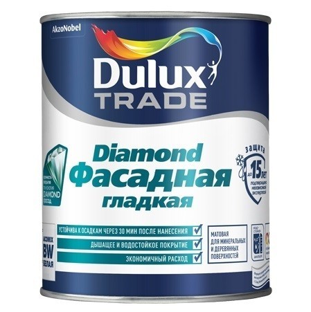 Краска Dulux база BW гладкая - матовая водно-дисперсионная фасадная краска для наружных работ по бетону, кирпичу и другим минеральным поверхностям. Образует прочное атмосферостойкое покрытие с высокой адгезией. Благодаря оптимальному сочетанию паропроницаемости и водостойкости образует "дышащее" покрытие, выводящее влагу с поверхности и не пропускающее ее вовнутрь, тем самым сохраняя подложку сухой и препятствуя разрушению поверхности под воздействием влаги. Активные добавки защищают фасад от грибка и водорослей, а стойкие к выгоранию пигменты сохраняют цвет на долгие годы. Фасадная краска по бетону подходит для холодного климата (до - 50 С). Обеспечивает надежную защиту минерального фасада на срок до 15 лет! (подтверждено независимой лабораторией). Краска легко наносится без разбрызгивания и потеков, не оставляет следов от инструмента. Предназначена для наружных работ. Dulux Фасадная Гладкая подходит для нанесения на полностью просохшие минеральные поверхности (бетон, штукатурку, кирпич и т. п.), каменную кладку и дерево. Рекомендуется для окрашивания фасадов жилых и общественных зданий в любых климатических зонах. Обратите внимание! База BW может применяться как белая краска, то есть использоваться самостоятельно, без колеровки. Базовая краска BW также предназначена для получения светлых и пастельных оттенков. От других «белых баз» база BW отличается более высоким содержанием белого пигмента — диоксида титана (TiO2). Благодаря этому вы сможете получить более белое и укрывистое покрытие. Преимущества краски фасадной гладкой: Атмосферостойкая, защита до 15 лет. Технология Diamond Фасад — экологичность водной краски и прочность алкидного покрытия. Образует дышащее покрытие. Устойчива к выцветанию. Содержит активные добавки против плесени и водорослей. Эластичное покрытие. Сверхадгезивная. Выдерживает осадки через 30 минут после нанесения. Экономичный расход. Применение: Перед применением разбавить в рекомендованной пропорции и тщательно перемешать. Рекомендуется наносить в два слоя при температуре воздуха и поверхности от +5 °C до +30 °C, относительной влажности воздуха от 40 до 80 %. Используйте кисть с синтетическим ворсом, валик для водно-дисперсионной краски или распылитель. Разбавление: для всех слоев — не более 1 части воды на 10 частей краски.