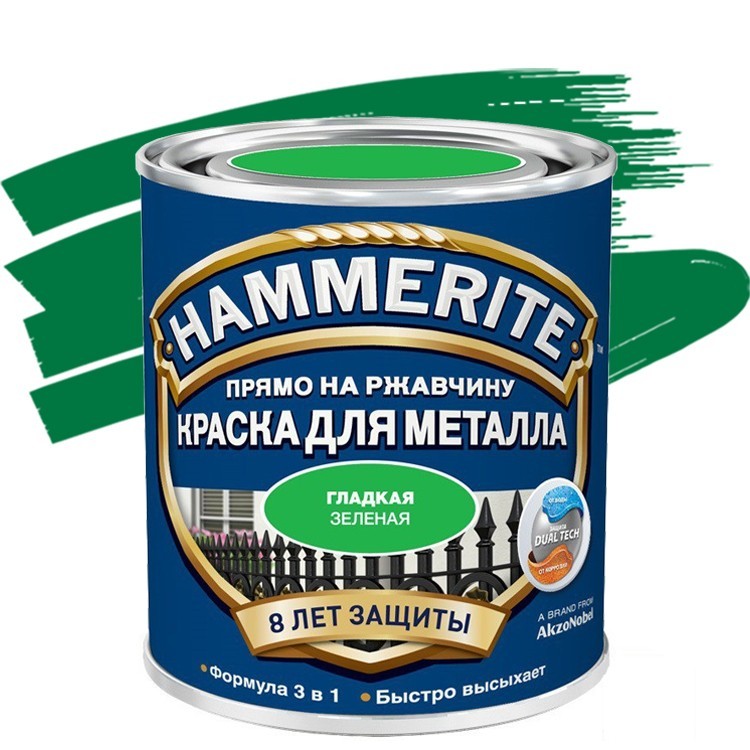 Краска по ржавчине Hammerite гладкая зеленая подходит для нанесения на ржавые неокрашенные и окрашенные ранее поверхности из чёрных металлов. Применяется для внутренних и наружных работ. Специальная формула 3 в 1 экономит ваше время и силы на подготовку поверхности. Образует износостойкое и эластичное покрытие, устойчивое к перепадам влажности и температурам. Стойкая к воздействию бытовых химикатов и кратковременному воздействию моторного топлива и масел. Быстро высыхает на поверхности благодаря особым компонентам, входящим в состав краски - время до нанесения второго слоя составляет около 4-6 часов. Поэтому вся работа может быть завершена за один день. Легко наносится без разбрызгивания и потеков, является тиксотропной краской. Обеспечивает экономичный расход — одним литром можно окрасить до 10 м² подготовленной поверхности. Новая формула Hammerite c технологией DualTech благодаря добавлению воска дает дополнительную усиленную защиту от проникновения воды к металлической поверхности. Благодаря этому краска еще эффективнее предотвращает появление ржавчины и создает ультрапрочное покрытие до 8 лет. Термостойкость покрытия гладкой краской до 80 С°. Краску можно наносить на оцинкованную сталь, гальванизированную поверхность, поверхности из цветных металлов (оцинкованных, алюминиевых) и пластик твердой фактуры. Краска Hammerite совместима с большинством лакокрасочных покрытий (акриловых, уретановых, алкидных, кремнийорганических и др.), за исключением материалов на битумной основе. Не подходит для окрашивания находящихся под водой поверхностей! Краска Hammerite гладкая может использоваться для следующих поверхностей: для гаражных металлических ворот. для металлических дверей, решеток, перил. для забора. для садовой мебели и садовых инструментов. для велосипеда. для забора. Преимущества гладкой краски по ржавчине Hammerite: Можно наносить прямо на ржавую поверхность, отличная укрывистость и адгезия. Ультрапрочное эластичное покрытие. Атмосферостойкое покрытие с грязе- и водоотталкивающими свойствами. Уникальная формула 3 в 1. Защищает металл от коррозии в течение 8 лет. Легко наносится, быстро высыхает на поверхности. Экономичный расход.