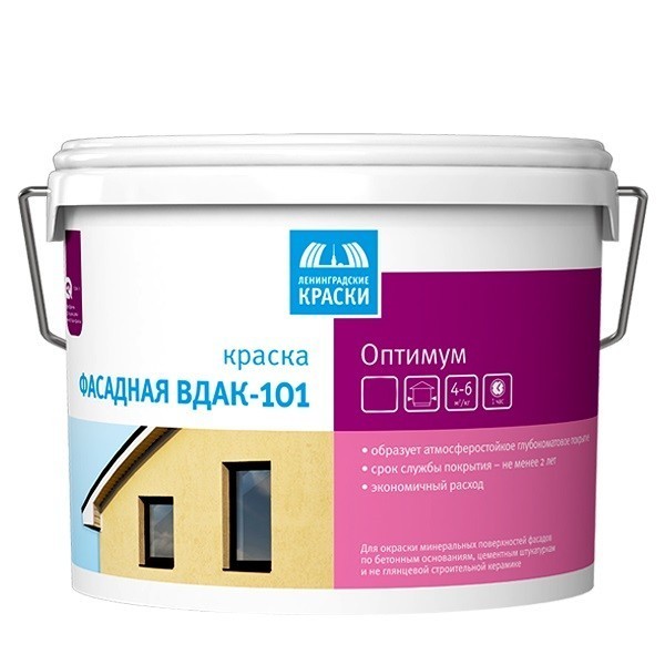 Ленинградские краски Оптимум ВДАК-101 - водно-дисперсионная акрилатная фасадная краска. Предназначена для окраски фасадов зданий и сооружений по минеральным поверхностям (бетонные основы, цементные штукатурки, не глянцевая строительная керамика), прочно держащимся покрытиям, ранее окрашенным водно-дисперсионными красками, за исключением окрашенных известковыми, силикатными красками и органическими эластичными покрытиями. Наносится кистью, валиком или распылением. При нанесении распылением применять сопло 0,018"–0,023", т.е. 0,450–0,580 мм. Для придания необходимого оттенка рекомендуется использовать колер краски «Профи» Текс (не более 10% от объема краски). Окрашиваемая поверхность должна быть сухой и влажность древесины должна быть менее 20%. Во время обработки и высыхания состава температура воздуха должна быть выше +5°С, а относительная влажность воздуха – ниже 80%. Не красить в жаркую погоду, при сильном ветре, под прямыми лучами солнца или при дожде. Расход на 1 слой: 4-6 м²/кг. Окончательный расход зависит от способа нанесения и впитывающей способности основания. Лучшей гарантией точности расчета будет пробная окраска на объекте. Преимущества краски фасадной Ленинградские краски: высокая атмосферостойкость и светостойкость; энономичный расход; быстро высыхает.