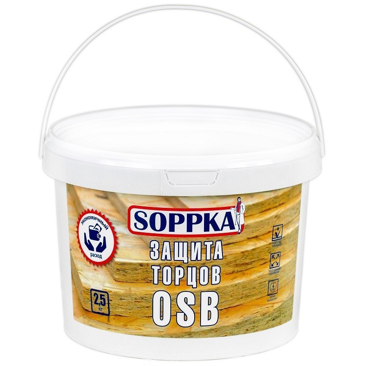 Защита торцов OSB Soppka предназначена для окрашивания кромок OSB. Рекомендуется для торцевой обработки плит OSB с целью укрепления и защиты от влаги, предотвращения разбухания и коробления плит в процессе эксплуатации. Плиты OSB, обработанные Soppka Защита торцов OSB, могут быть использованы как внутри, так и снаружи помещений. Состав: суспензия наполнителей, пигментов, целевых добавок и различных вспомогательных веществ в стирол-акриловой дисперсии. Преимущества средства для защиты торцов OSB Soppka: Препятствует проникновению воды через торцевые поверхности плит. Защищает плиты от разбухания при воздействии атмосферных осадков. Снижает коробление плит. Многократно увеличивает срок службы плиты. Образует эластичное покрытие. Создает водоотталкивающий барьер. Выпускается в готовом виде. Быстрая обработка – время обработки пачки OSB менее 2 минут. Экономичный расход (около 5 г на 1 пог. м). Порядок применения: Обрабатываемая поверхность OSB должна быть сухой, чистой. Очистите поверхность от загрязнений, отслаивающихся фрагментов, старой краски, воска, смолы и т.д. После очистки, поверхность необходимо зашкурить и обеспылить. Перед применением тщательно перемешать. Нанесите в 1-2 слоя до достижения требуемого расхода кистью или валиком. При обработке пачки листов OSB целиком, в случае склеивания листов между собой, необходимо после высыхания произвести надрезы малярным ножом и отделить листы друг от друга. Работы проводить при температуре воздуха от +10 °С до +30 °С и относительной влажности воздуха не более 65%. Следующий слой наносить не ранее, чем через 2-3 часа (при температуре (+20 ±3) °С и относительной влажности воздуха 65%). При более низких температурах время высыхания увеличивается. Инструмент после окончания работ промыть водой (или мыльным раствором). Дальнейшие работы следует производить не ранее, чем через 24 часа после нанесения Soppka Защита торцов. Внимание! Перед окрашиванием необходимо проверить совместимость с лакокрасочными материалами, применяемыми для окраски поверхности OSB. На время высыхания необходимо защитить обработанную поверхность от атмосферных осадков. Расход на один слой зависит от свойств окрашиваемой поверхности. Средний расход для плиты толщиной 9 мм составляет 4,5-5,4 г/пм. Меры предосторожности: При проведении работ использовать индивидуальные средства защиты (очки, перчатки, респиратор, защитная одежда). При попадании на кожу смыть его большим количеством воды. При попадании в глаза немедленно промыть их струей проточной воды в течение 10-15 минут, при необходимости обратиться к врачу. Курить и принимать пищу на месте проведения работ запрещается. После проведения работ (а также перед едой и курением) необходимо тщательно вымыть руки и лицо. Вызывает раздражение кожных покровов и слизистых оболочек. Хранить в невскрытой заводской таре при температуре от +5°С до +40°С на расстоянии не менее 1,5-2 м от источников отопления. Не подвергать воздействию солнечных лучей. Не складировать вблизи нагревательных приборов. Транспортировать отдельно от пищевых продуктов. Срок хранения: 18 месяцев.