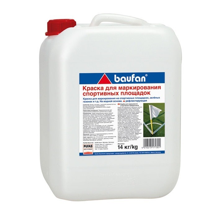 Краска для маркирования спортивных площадок Pufas Baufan представляет собой рефлектирующую, водорастворимую, экологически чистую краску без формальдегидов и растворителей. Предназначена для нанесения сплошных линий разметки на спортивных площадках, натуральных газонах, теннисных кортах и т.п. Обладает высокой степенью прилипания на сухой траве и хорошей видимостью при дожде. Особенно рекомендуется при использовании прожекторного освещения. Состав: акриловая дисперсия, карбонат кальция, диоксид титана, а также специальные рефлектирующие добавки. Преимущества краски для маркирования Pufas Baufan: высокая укрывистость; быстро сохнущая; экономный расход; устойчива к дождю; высокая стойкость к истиранию; способная к биологическому расщеплению; безвредная; без запаха. Применение. Предназначенная для маркирования поверхность должна быть сухой. Газон должен быть по возможности коротко острижен. Перед применением краску хорошо размешать. Тщательно перемешать её с желаемым количеством воды. Краска для маркирования спортивных площадок может быть разбавлена водой 1:5, где пять частей воды. Чем меньше воды, тем выше яркость краски. Подходящее соотношение смешивания определять путём пробного маркирования. Нанесение производится аппаратом для маркирования методом напыления. Разведённую краску сразу использовать во избежание образования осадков. Время высыхания зависит от температуры окружающей среды (от 2 до 5 часов). Относительная влажность выше 90%, особенно в связи с низкими температурами, может значительно повлиять на время высыхания и качественные показатели Рабочая температура – минимум + 5 °С для материалов и воздуха (температура почвы!)