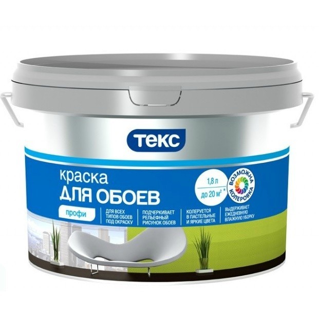 Краска для обоев Текс Профи - водно-дисперсионная краска. Предназначена для высококачественной окраски всех типов обоев под окраску: структурных, флизелиновых, виниловых, текстурированных и стеклообоев и отделки стен внутри сухих помещений и помещений с повышенной влажностью (кухни, ванные, коридоры) по бетонным, оштукатуренным, гипсокартонным, кирпичным, деревянным поверхностям. Краска образует идеально подчеркивающее и сохраняющее рисунок обоев с мелкой текстурой покрытие, выдерживающее влажную уборку. Рекомендована для окраски в детских дошкольных учреждениях, домах ребенка, учебных и лечебных заведениях. Содержание летучих органических соединений в соответствии с Европейской Директивой 2004/42/СЕ. Колеруется каталогу цветов Текс или колер красками «Профи» Текс. Основа D предназначена для машинной колеровки и используется только в колерованном виде. Применение: Наносится валиком, кистью или распылением в 2 слоя. При необходимости разбавляется водой не более чем на 5% по объёму. Окрашиваемая поверхность должна быть сухой и чистой, температура поверхности, краски и воздуха должна быть не менее 5°С, а относительная влажность воздуха ниже 80%. Время высыхания краски при температуре 20±2 оС и относительной влажности 65±5 % составляет 1 час. Следующий слой можно наносить через 1,5 часа. Заданный уровень устойчивости покрытия к мытью достигается через 2 недели. Хранить краску следует при температуре не ниже 5°С в плотно закрытой таре, предохраняя от воздействия влаги, тепла и прямых солнечных лучей. Гарантийный срок хранения в заводской невскрытой упаковке – 2 года. Преимущества краски для обоев Текс Профи: Подчеркивает рельефный рисунок обоев. Сохраняет рисунок и чистоту цвета длительное время. Выдерживает ежедневную влажную уборку. Обратите внимание! Краска пожаро- и взрывобезопасна, не имеет неприятного запаха. Не смешивать с другими красками и растворителями. Избегать попадания в глаза, при попадании промыть большим количеством воды, хранить в недоступном для детей месте. Проводить работы в проветриваемом помещении. Для защиты рук применять резиновые перчатки.