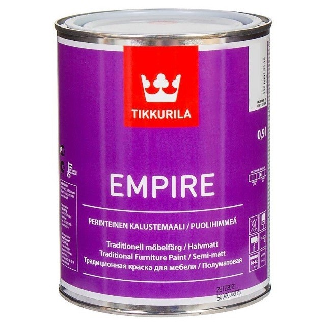 Краска для мебели Tikkurila Empire - тиксотропная алкидная краска. Прендназначена для окраски металлических и деревянных поверхностей, древесностружечных и древесноволокнистых плит внутри помещений. Empire хорошо выравнивается по поверхности и легко наносится кистью. Применяется для окраски мебели, дверей, радиаторов, оконных переплетов внутри здания, садовой мебели и т.д. Колеруется по каталогам "Тиккурила Симфония". База C может использоваться только в заколерованном виде. Окрашиваемая поверхность должна быть сухой. Температура воздуха выше +5°С и относительная влажность воздуха менее 80%. Расход: 10-12 м2/л. Особенности краски для мебели Tikkurila Empire: Краска Эмпире разработана Тиккурила специально для окраски деревянной и металлической мебели, в том числе садовой. Она обладает слабым запахом, легко наносится и равномерно, без подтеков распределяется по поверхности. Также прекрасно подходит для окраски дверей, радиаторов или окон внутри дома. Эмпире – тиксотропная краска. Благодаря загустителям в своем составе она не дает подтеков даже при нанесении на вертикальную поверхность. Работать с такой густой краской – одно удовольствие: она не стекает с кисти и не оседает на дне банки. Краску Эмпире можно колеровать в более чем 20 000 оттенков гаммы «Тиккурила Симфония», воплощая самые тонкие замыслы дизайнера. Полуматовое покрытие украшает мебель сдержанным блеском и в то же время практично: на нем почти не заметны отпечатки пальцев. Внимание! Избегать вдыхания паров растворителей или красочной пыли от распыления. Организовать эффективный воздухообмен. На краску имеется паспорт техники безопасности .